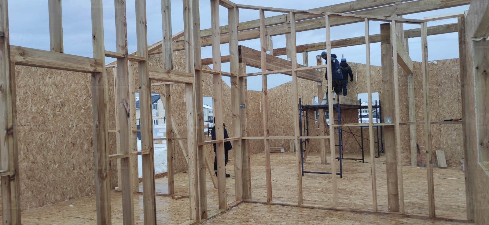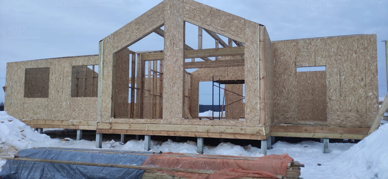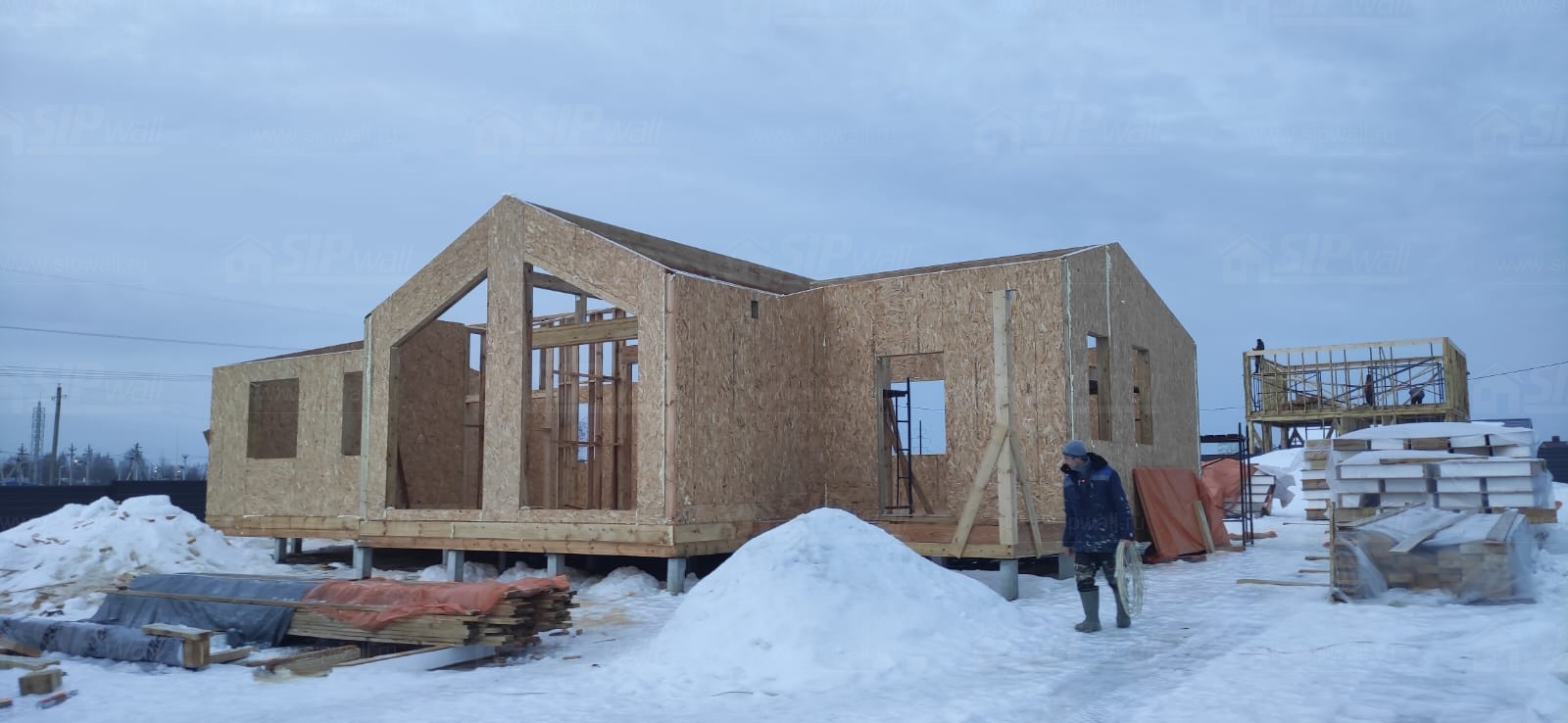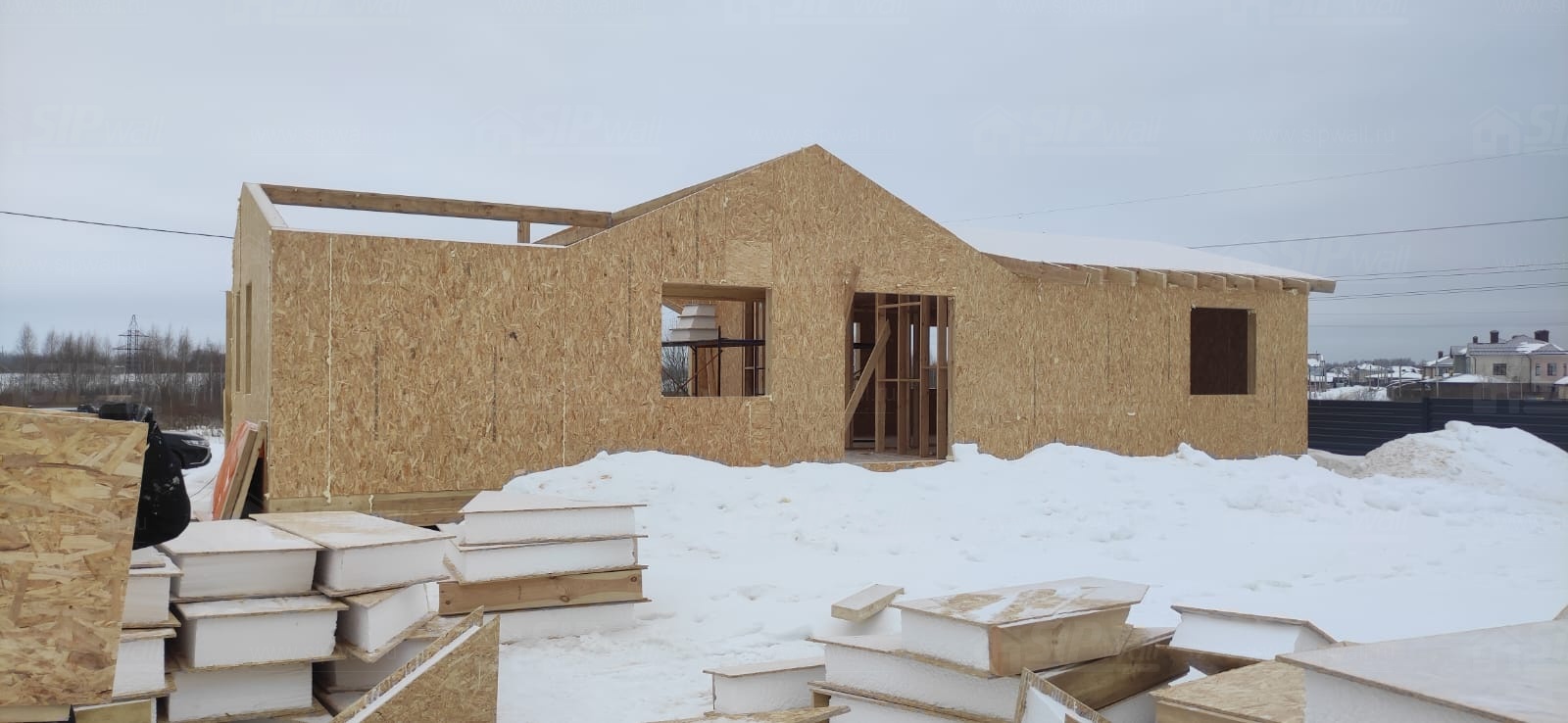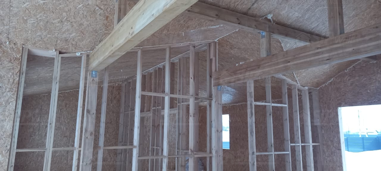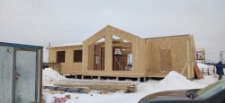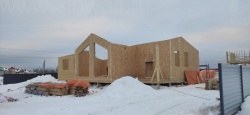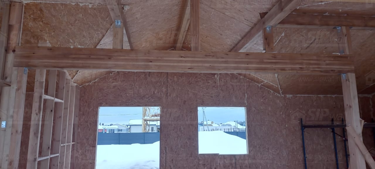 Все СИП панели SIPwall толщиной 224/174/124 мм (плиты OSB-3 толщиной 12 мм "Калевала" Россия и фасадный пенополистирол ППС-14 толщиной 200/150/100 мм производства, Россия) нарезаны и обрусованы сухим строганным брусом камерной сушки в соответствии с проектной документацией.