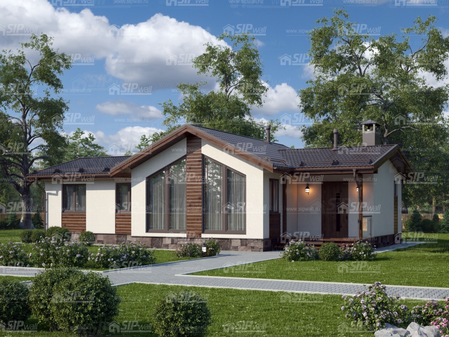 Комплектация домокомплекта: перекрытие на отметке +0.000 - СИП - 174У мм, несущие стены дома выполнены из СИП панелей 174 мм, внутренние несущие стены - СИП 174 мм, не несущие стены - СИП 124 мм Кровля - СИП 174У.
