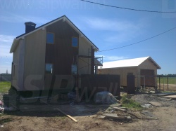 Домокомплект - изготовлен по индивидуальному проекту из СИП панелей произведенный по технологии SIPwall (ЭКОПАН) на собственном заводе расположенном в г. Шуя, Ивановской области. При изготовлении домокомплекта панельно каркасного дома используется только сухой строганный брус камерной сушки, обработанный огнебиозащитным составом.