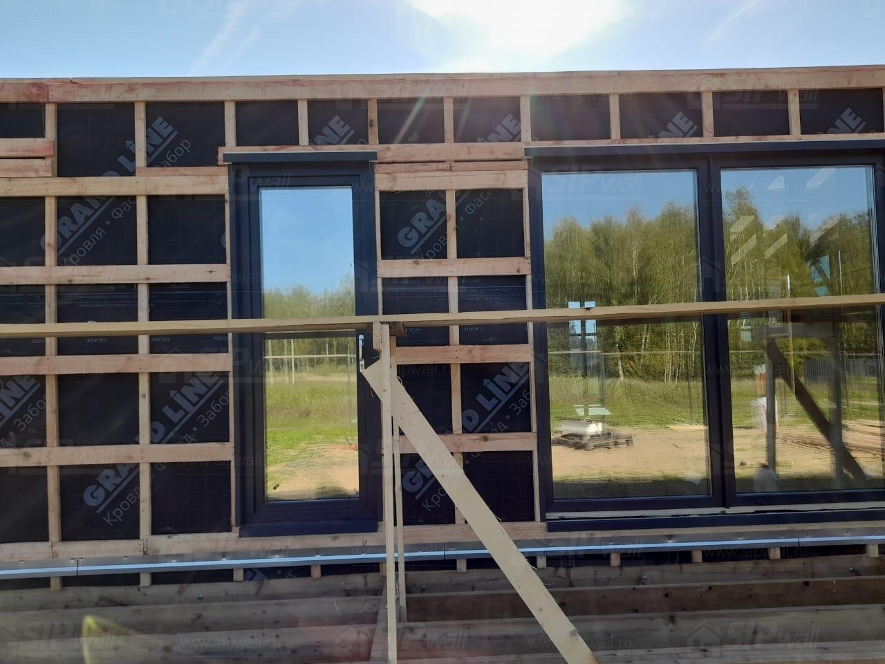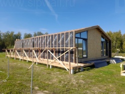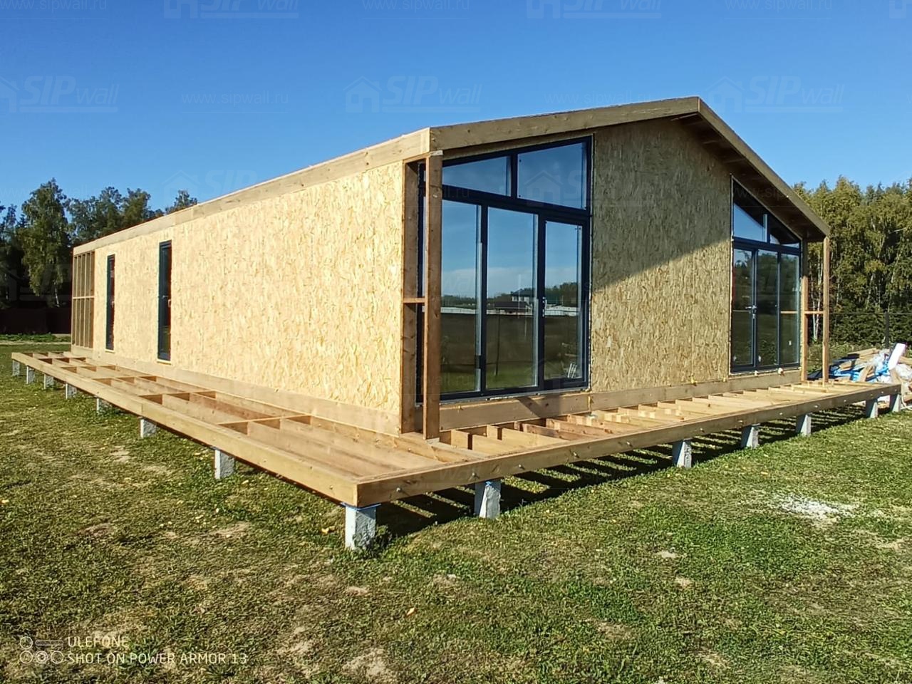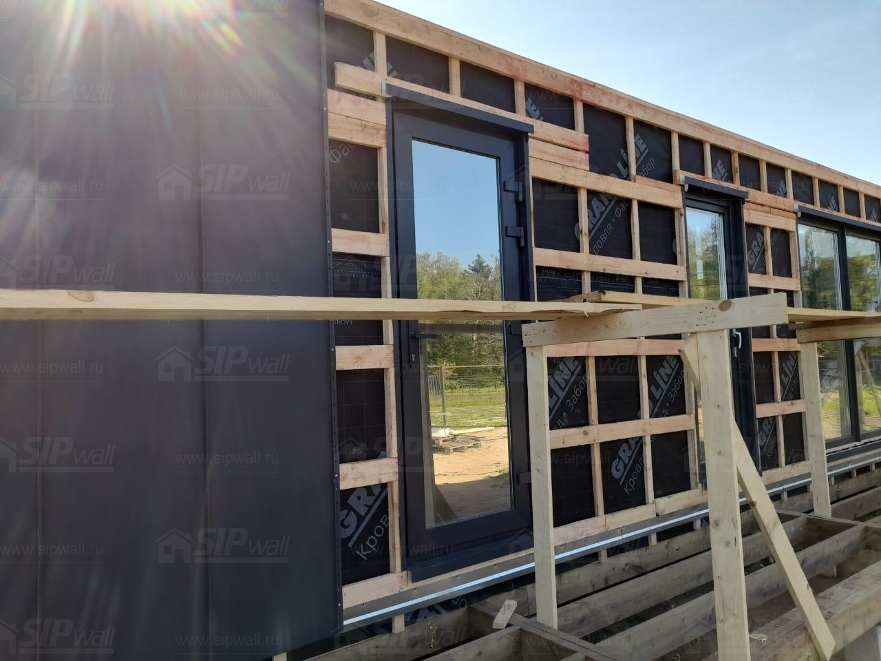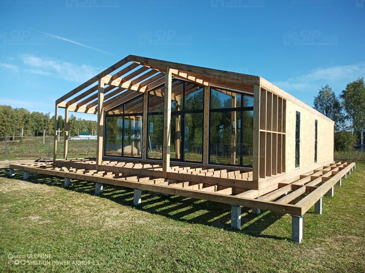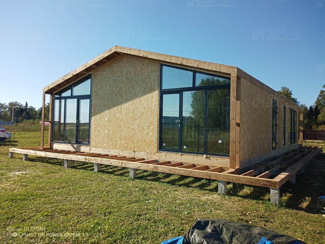 Сборка домокомплекта: Монтаж стен и перекрытий из СИП панелей, что гарантирует высокую теплоизоляцию и прочность.