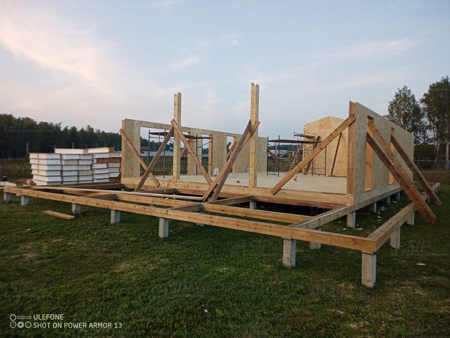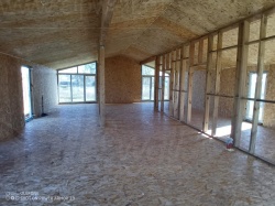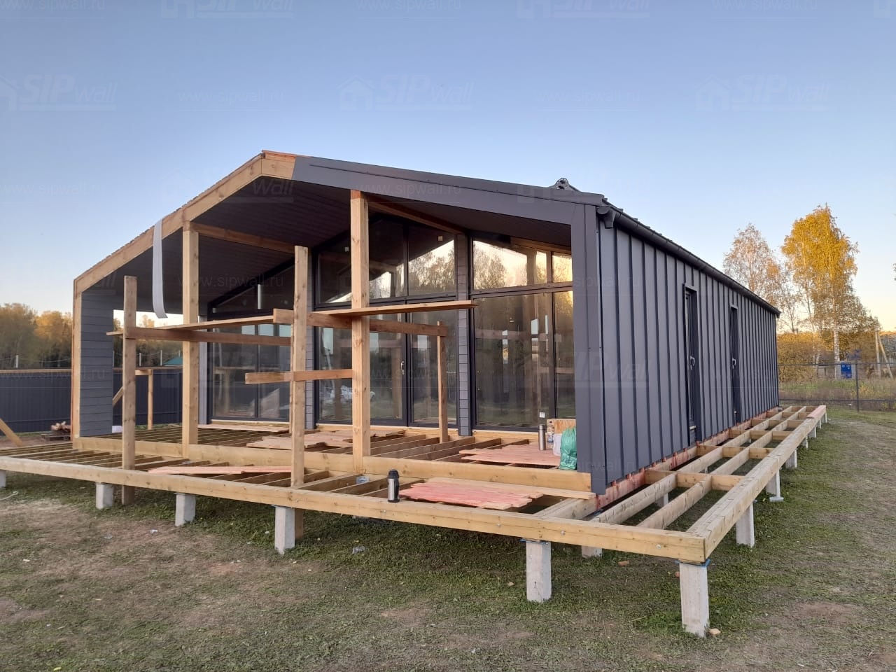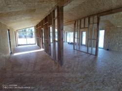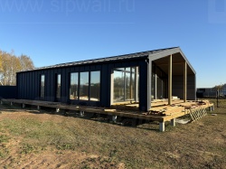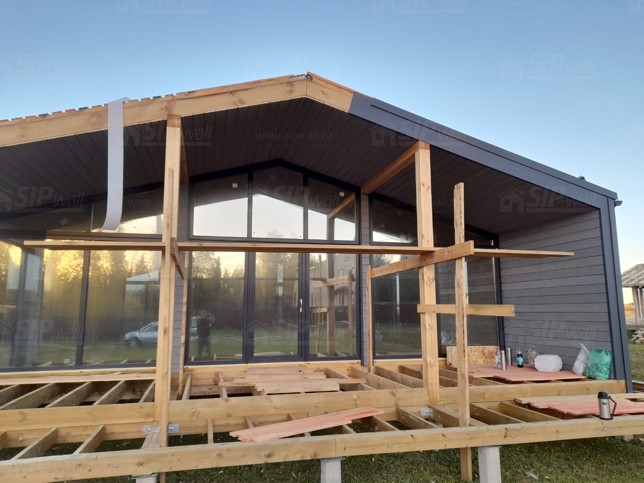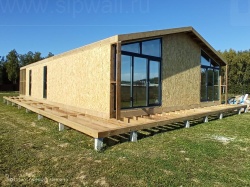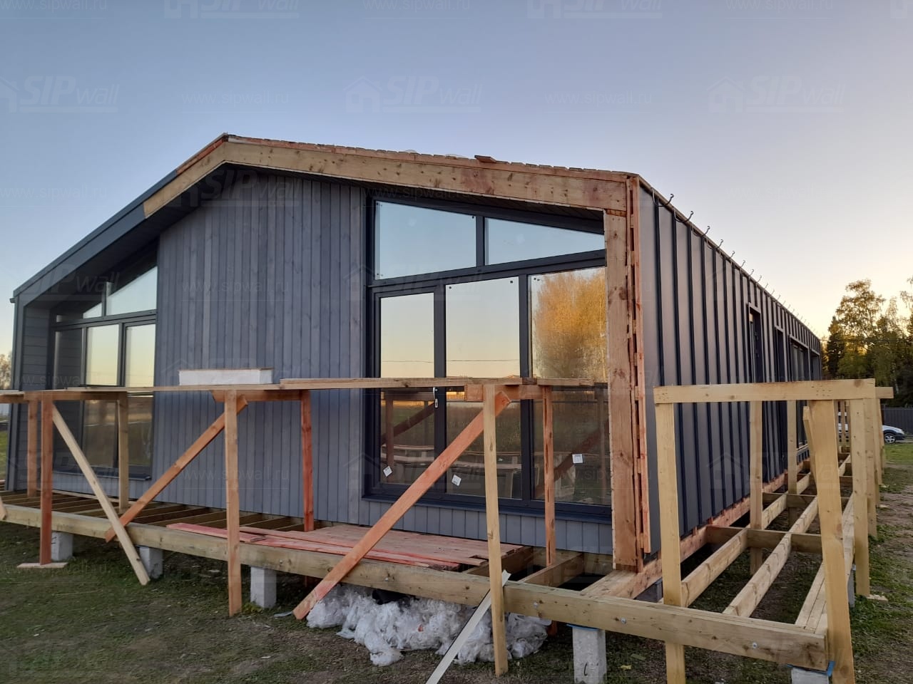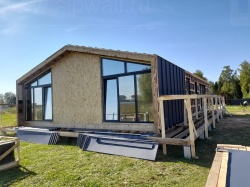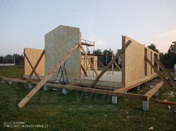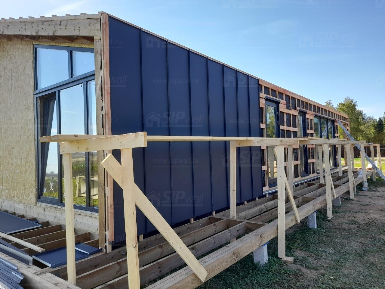 Сборка домокомплекта: Монтаж стен и перекрытий из СИП панелей, что гарантирует высокую теплоизоляцию и прочность.