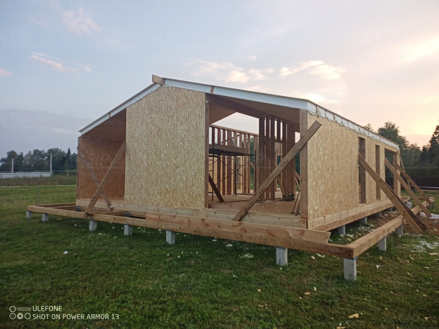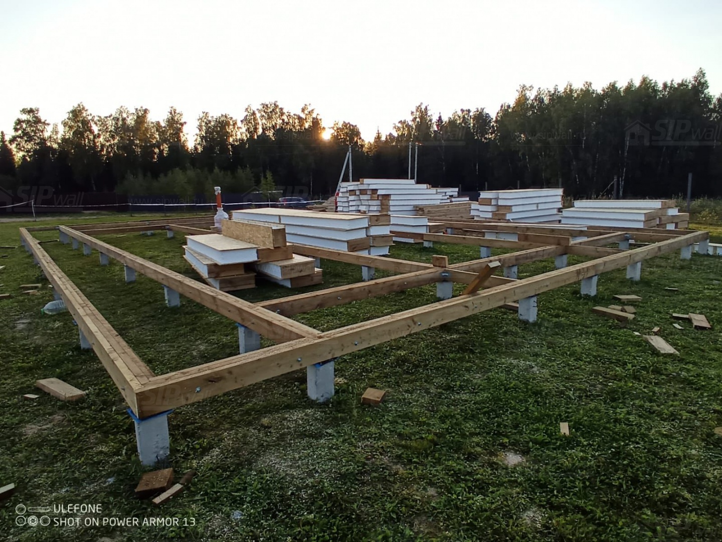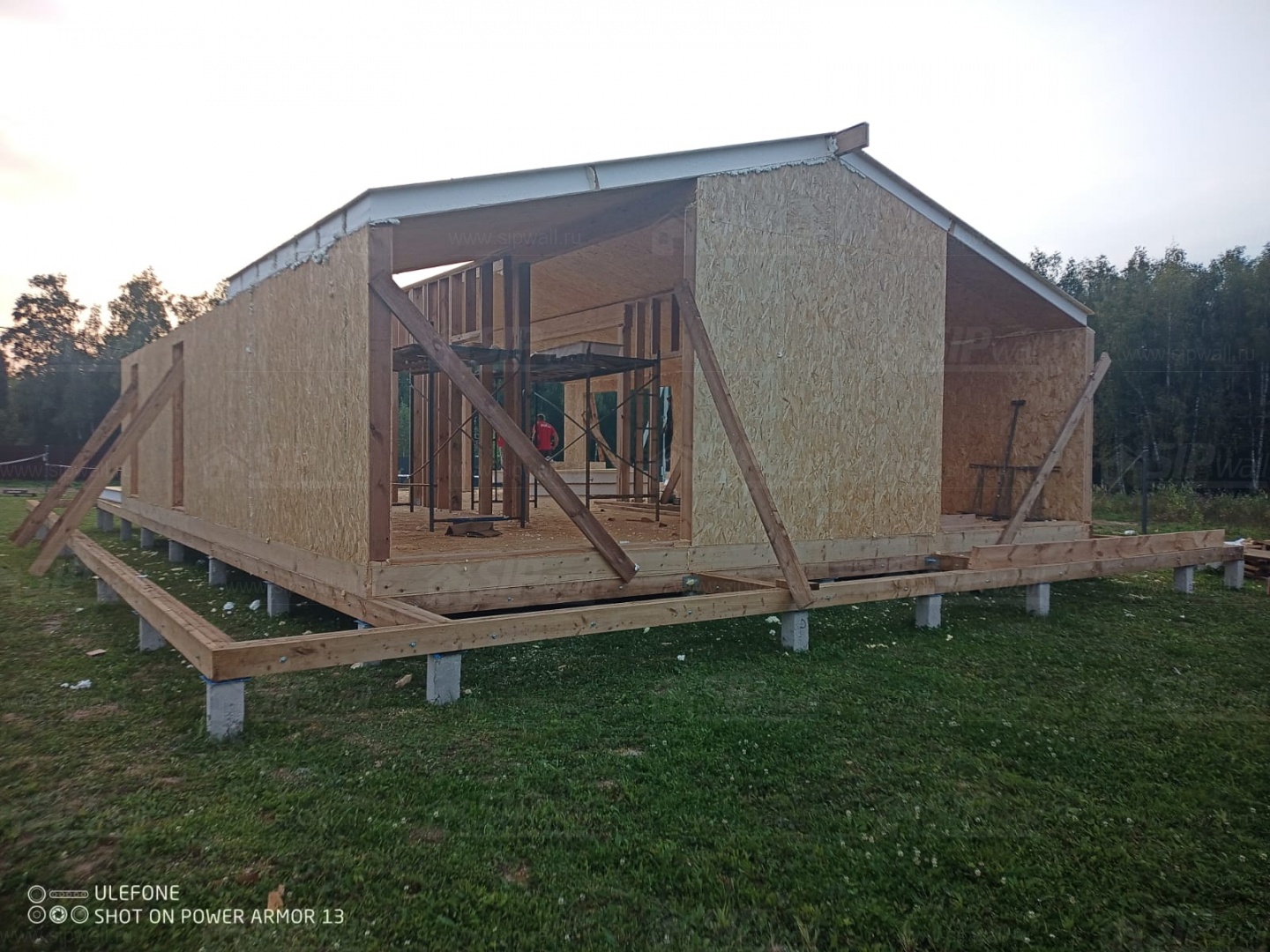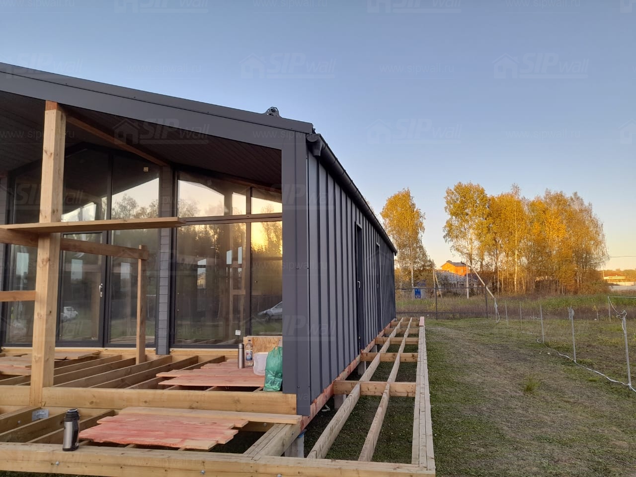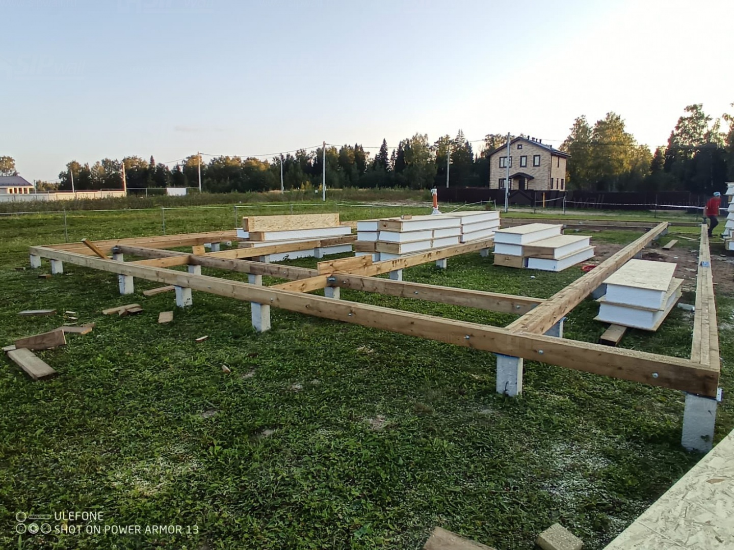 Сборка домокомплекта: Монтаж стен и перекрытий из СИП панелей, что гарантирует высокую теплоизоляцию и прочность.