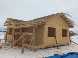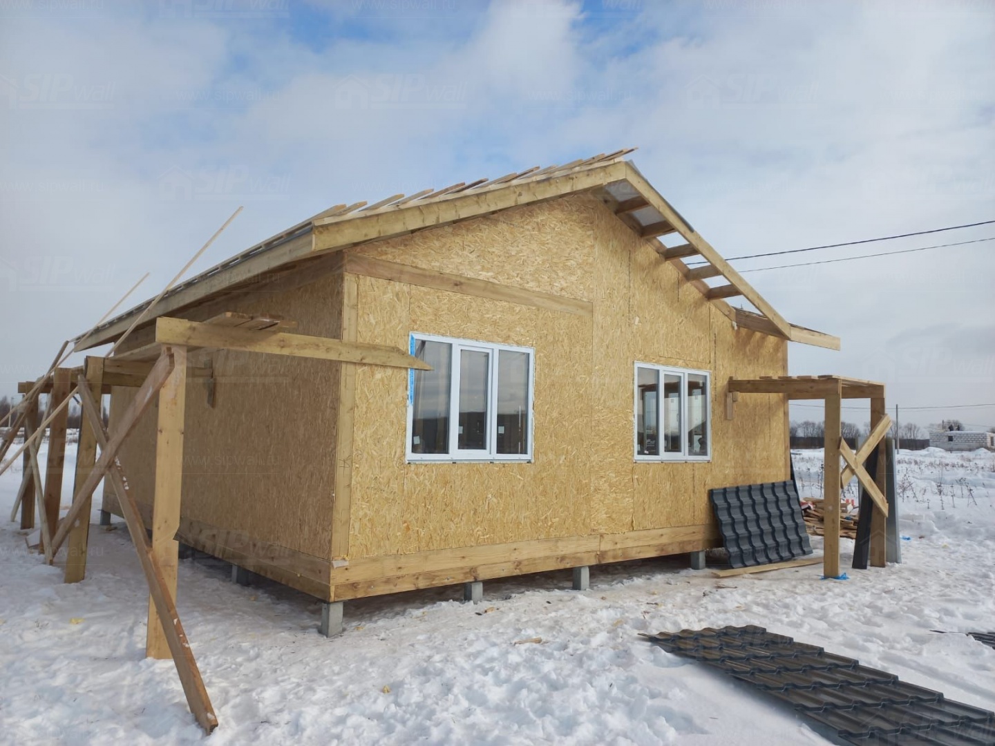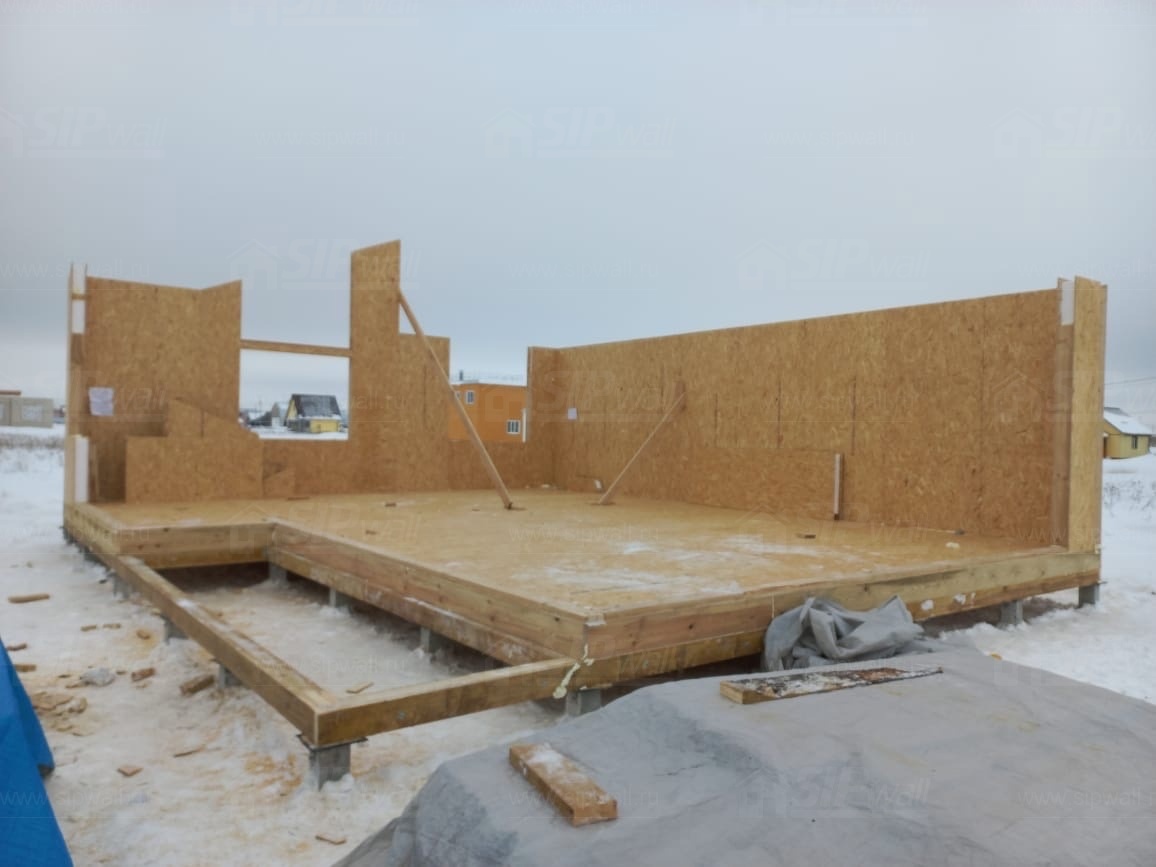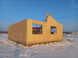 Комплектация домокомплекта: перекрытие на отметке +0.000 - СИП - 174У мм, несущие стены дома выполнены из СИП панелей 174 мм, внутренние несущие стены - СИП 174 мм, не несущие стены - СИП 124 мм Кровля - СИП 174У.