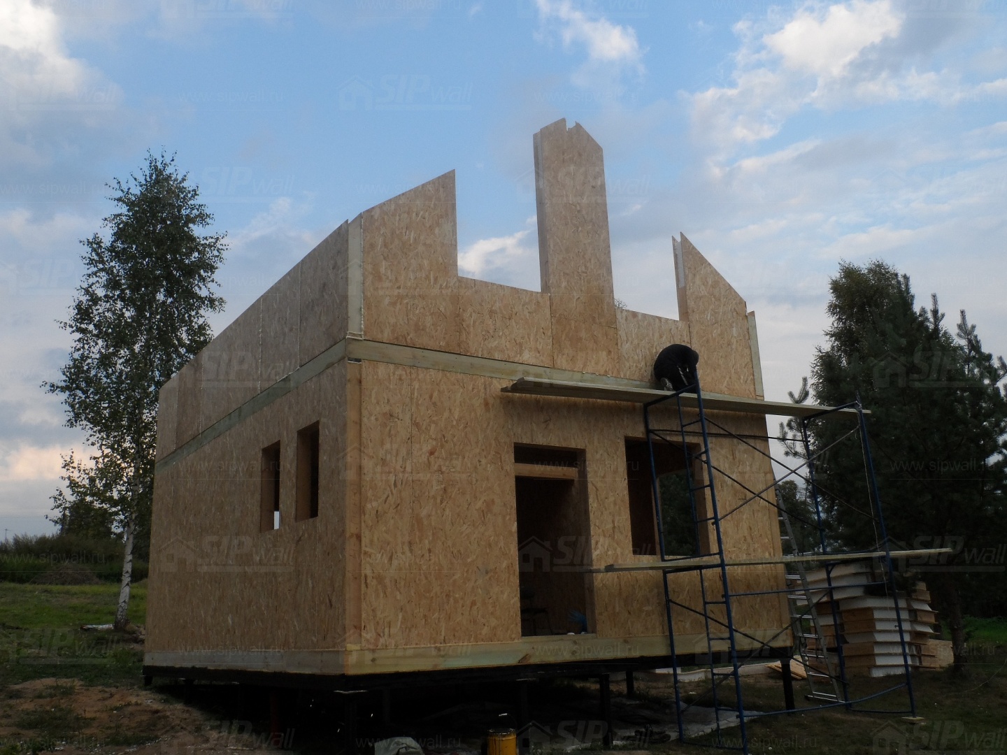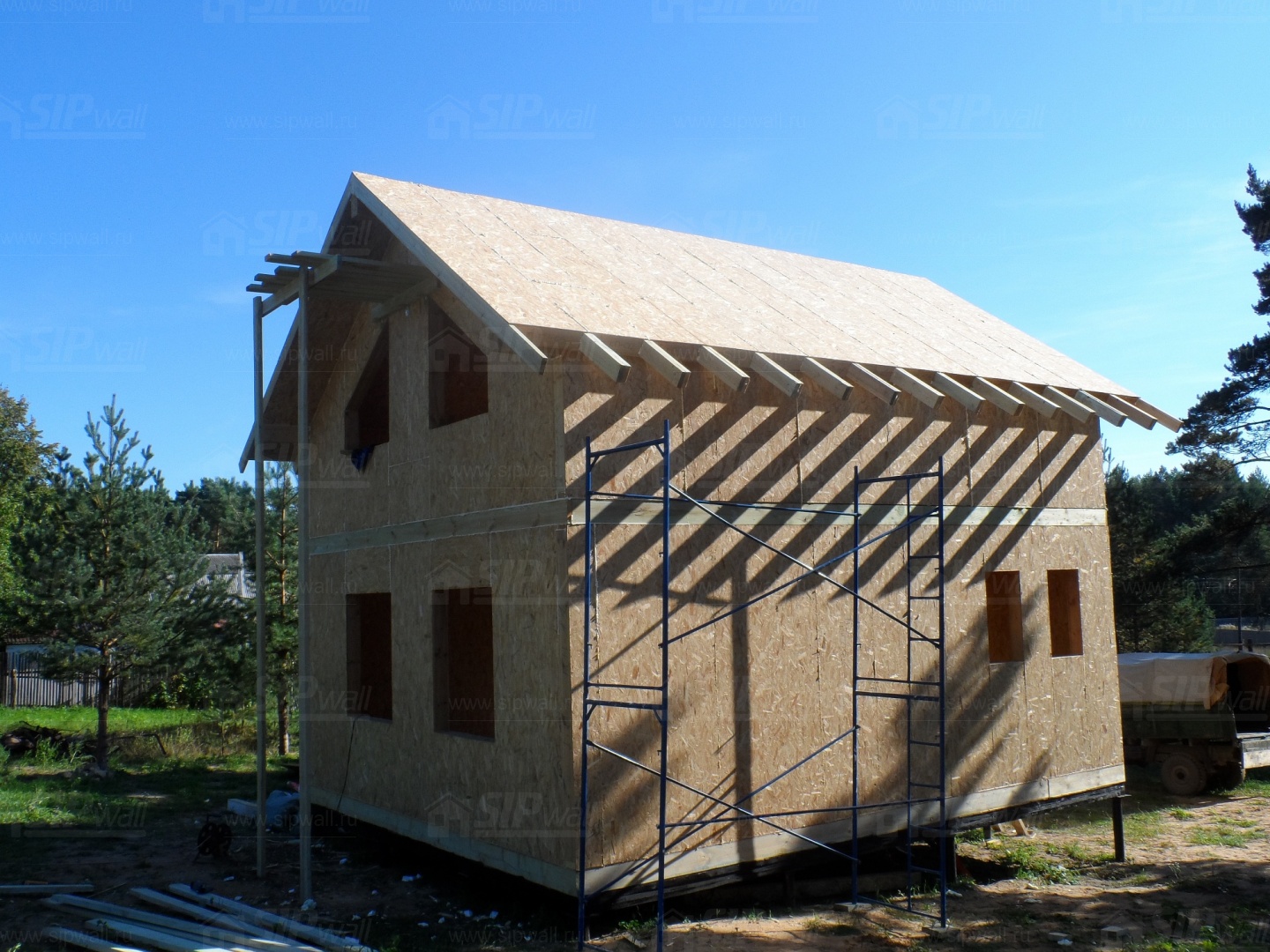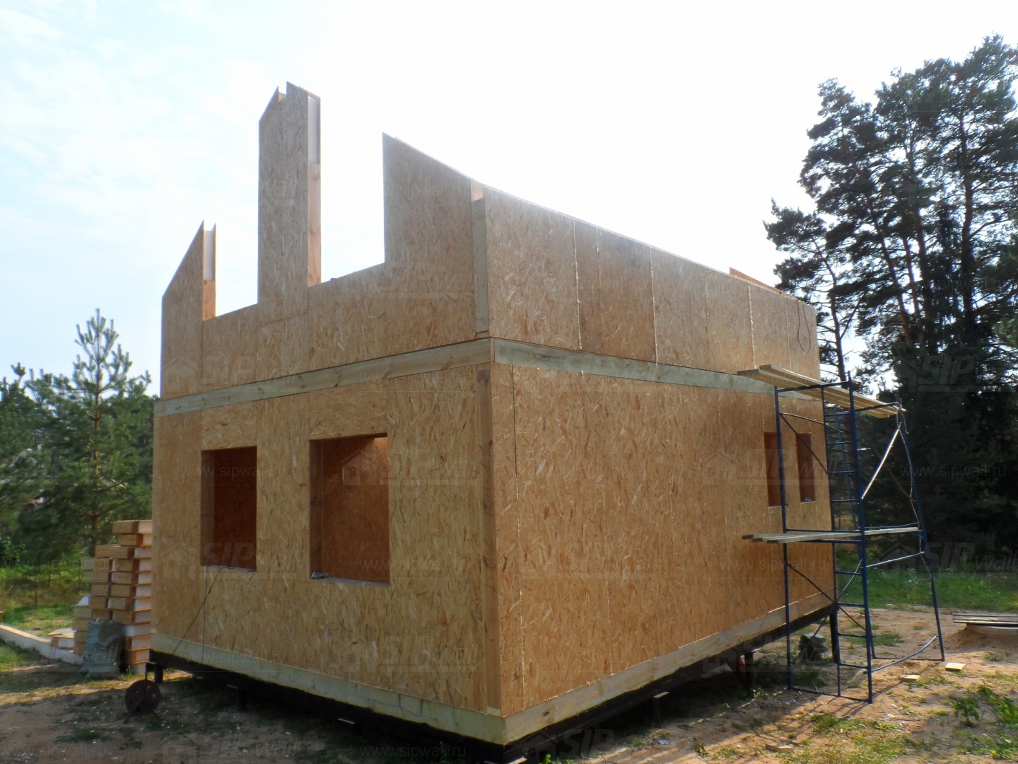 Все СИП панели SIPwall толщиной 224/174/124 мм (плиты OSB-3 толщиной 12 мм "Калевала" Россия и фасадный пенополистирол ПСБ-С 25 по ГОСТ 15588-14 толщиной 200/150/100 мм производства завода "PolarPlast", Россия) нарезаны и обрусованы сухим строганным брусом в соответствии с проектной документацией.