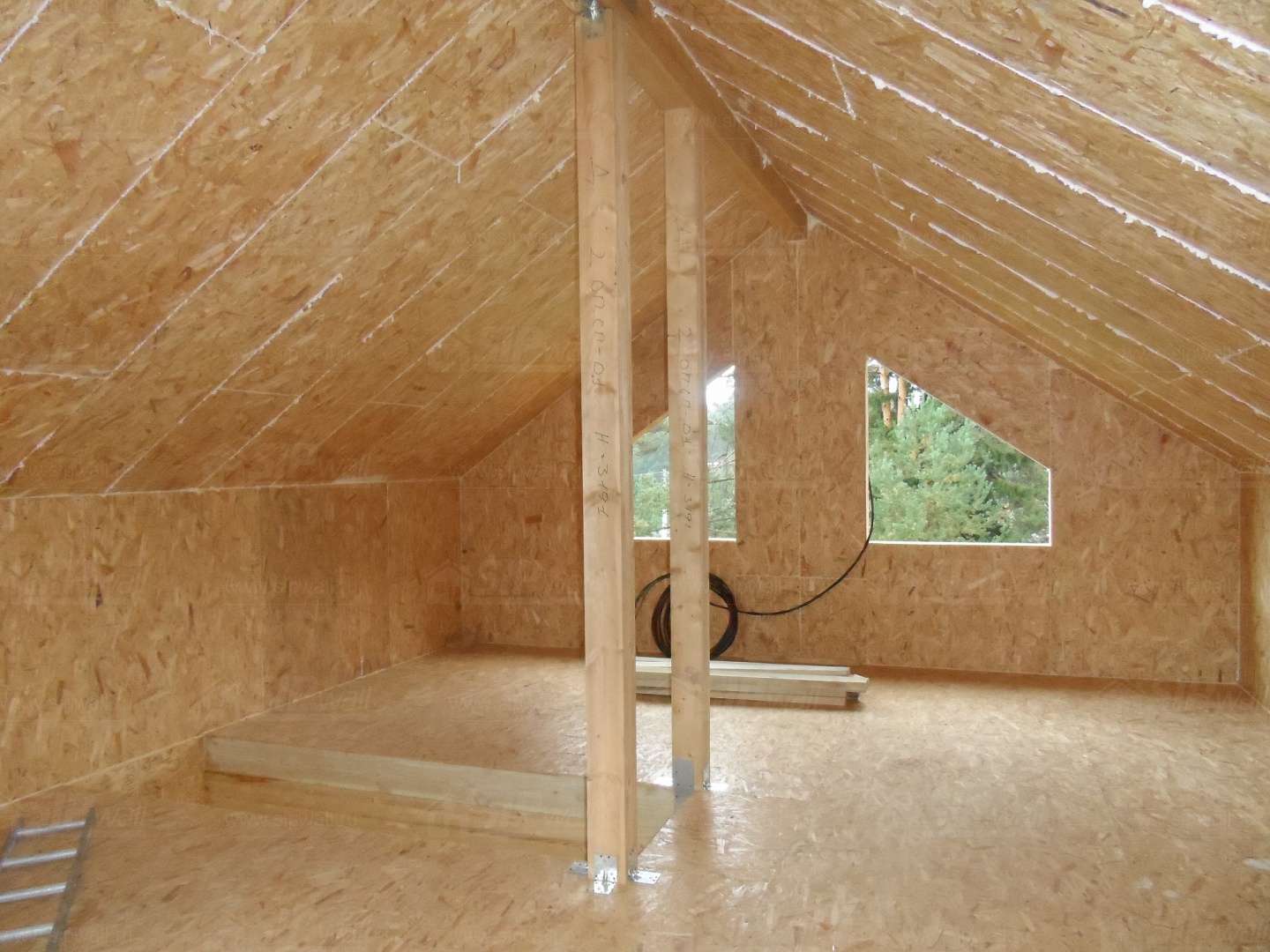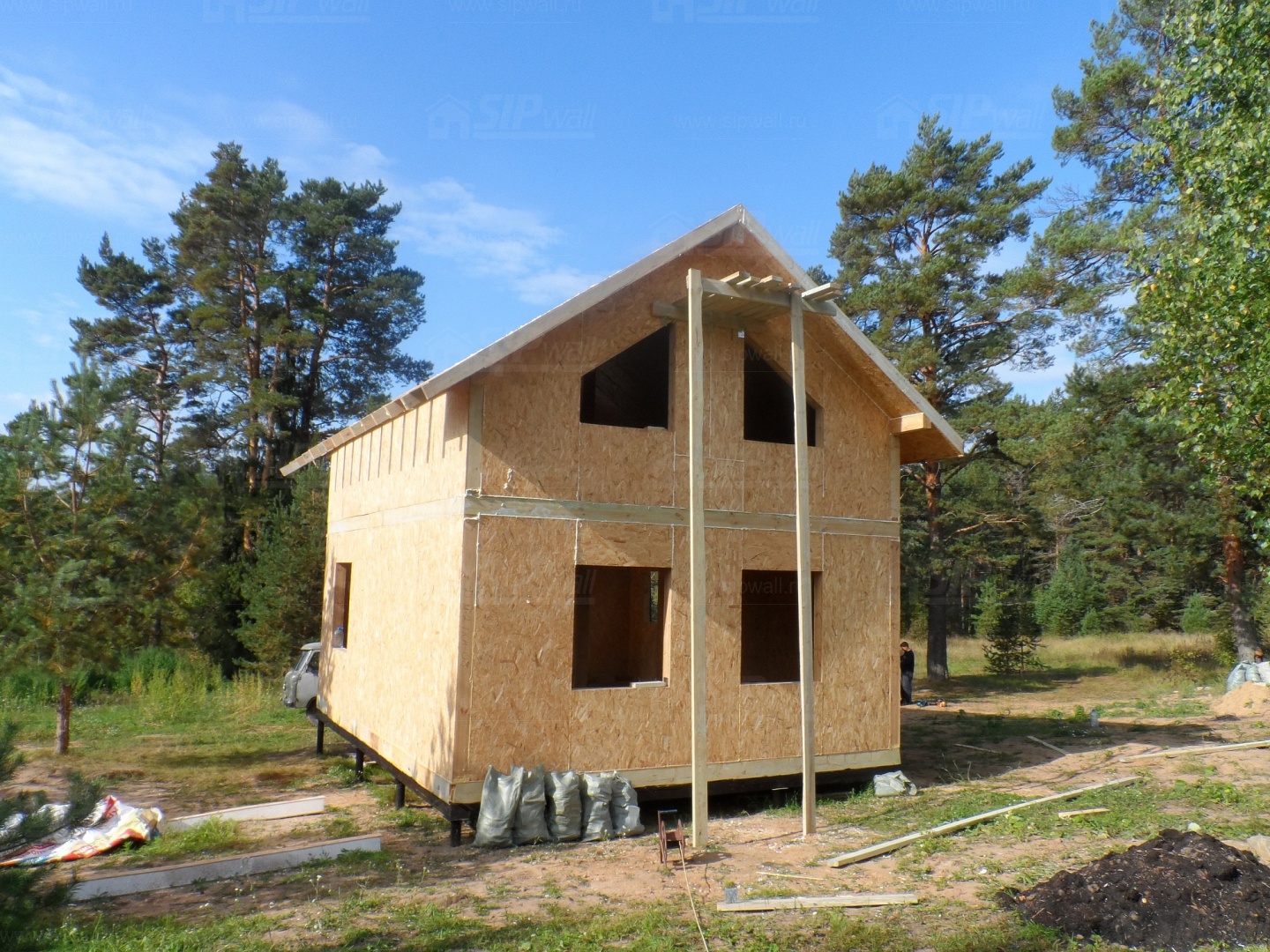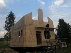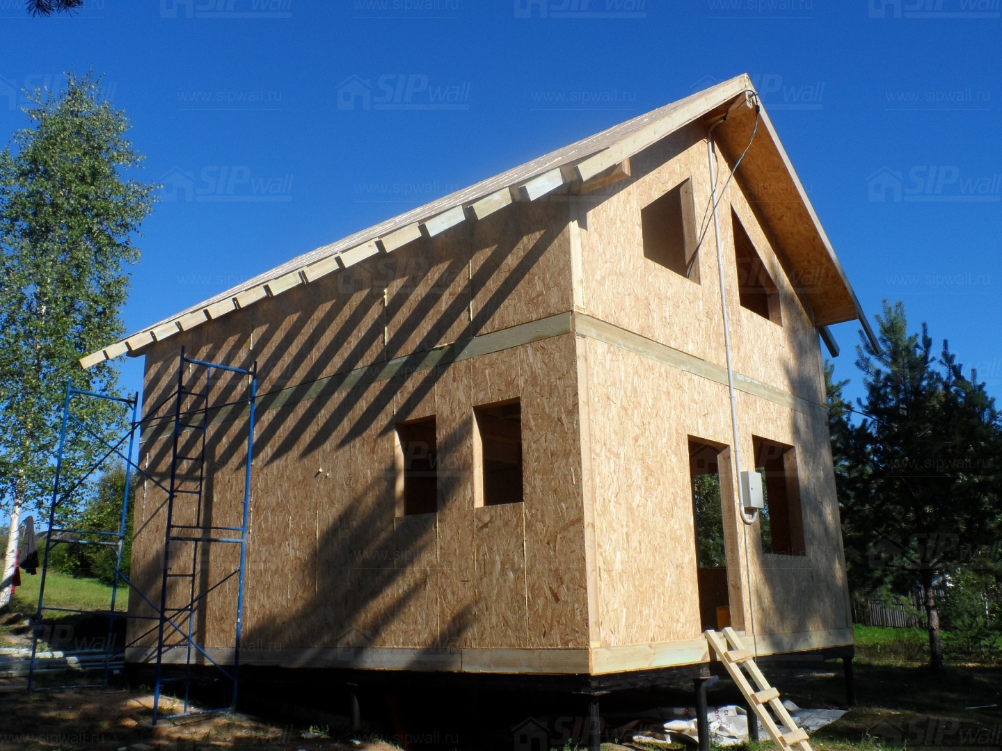 Все СИП панели SIPwall толщиной 224/174/124 мм (плиты OSB-3 толщиной 12 мм "Калевала" Россия и фасадный пенополистирол ПСБ-С 25 по ГОСТ 15588-14 толщиной 200/150/100 мм производства завода "PolarPlast", Россия) нарезаны и обрусованы сухим строганным брусом в соответствии с проектной документацией.