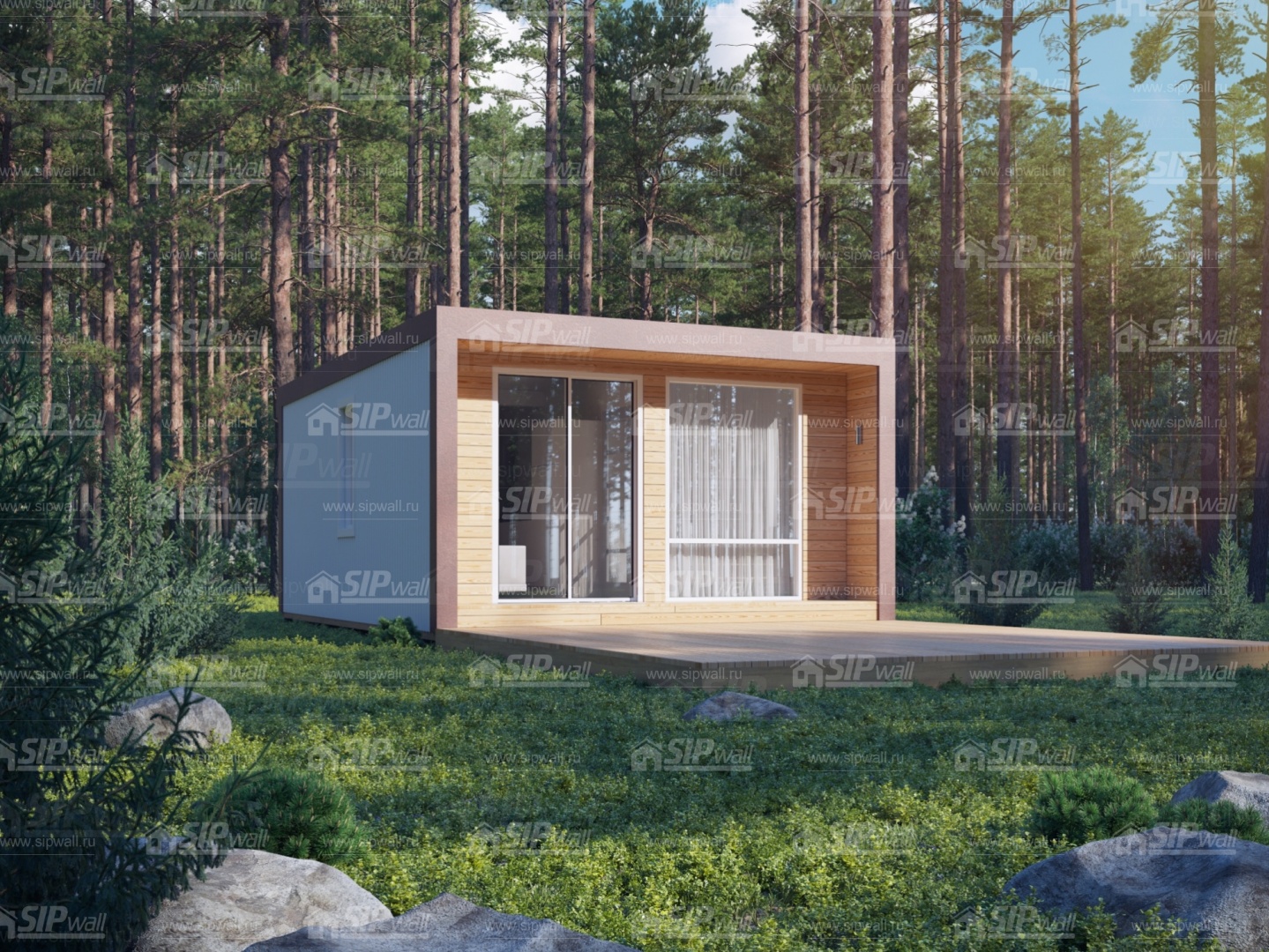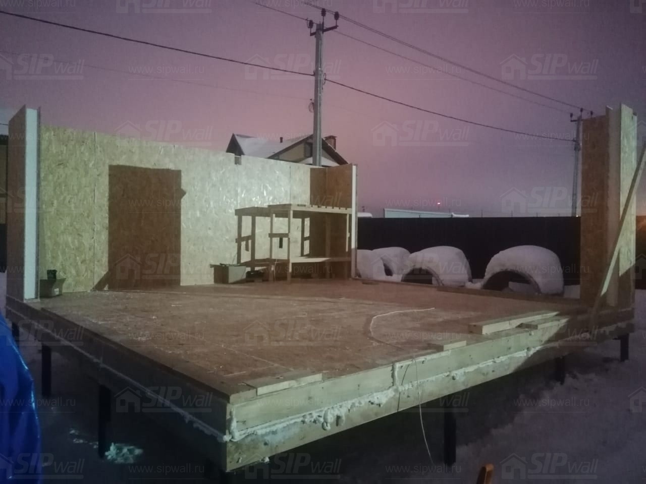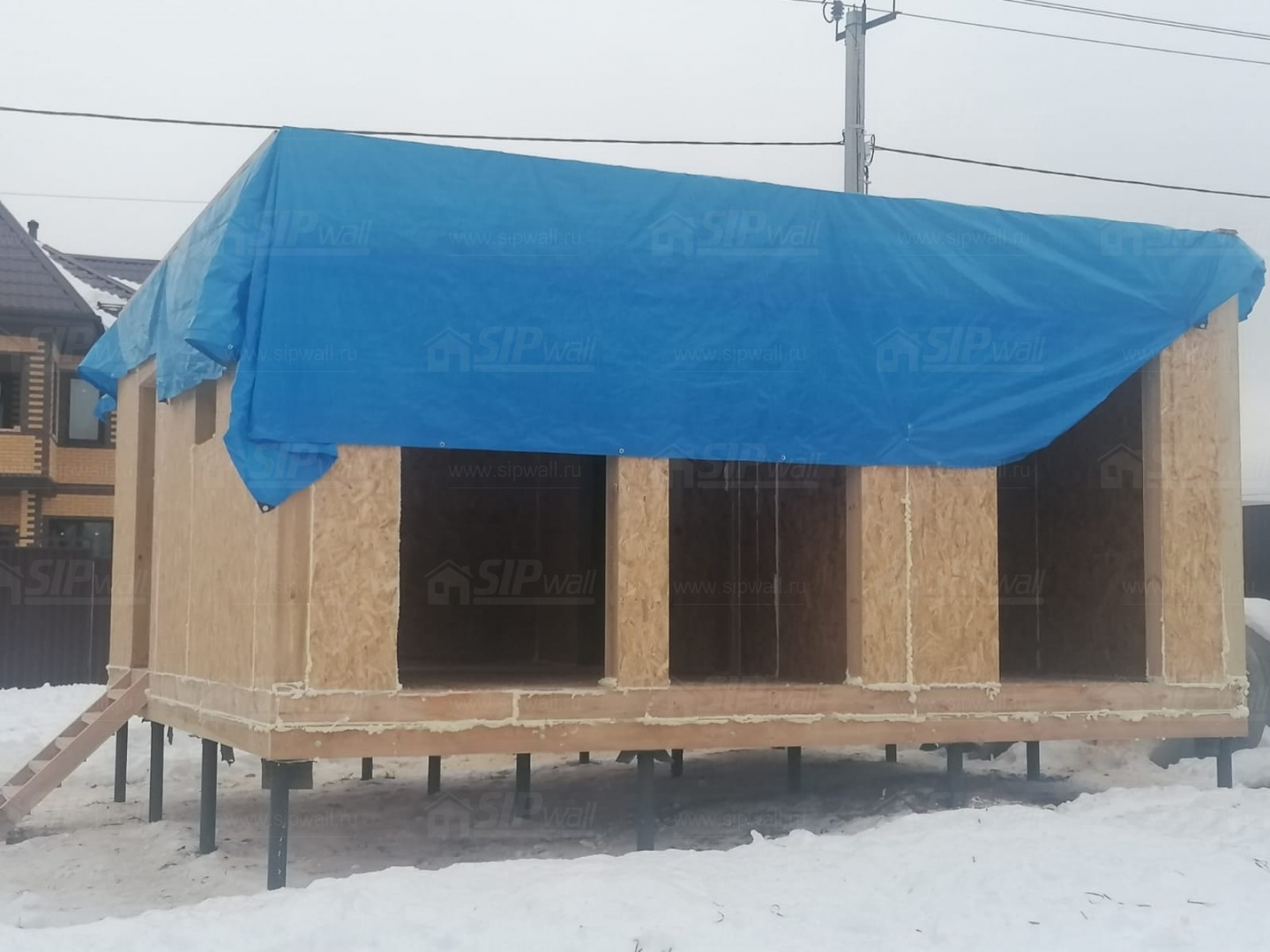 Комплектация домокомплекта: перекрытие на отметке +0.000 - СИП - 174У мм, несущие стены дома выполнены из СИП панелей 174 мм, внутренние несущие стены - СИП 174 мм, не несущие стены - СИП 124 мм Кровля - СИП 174У.