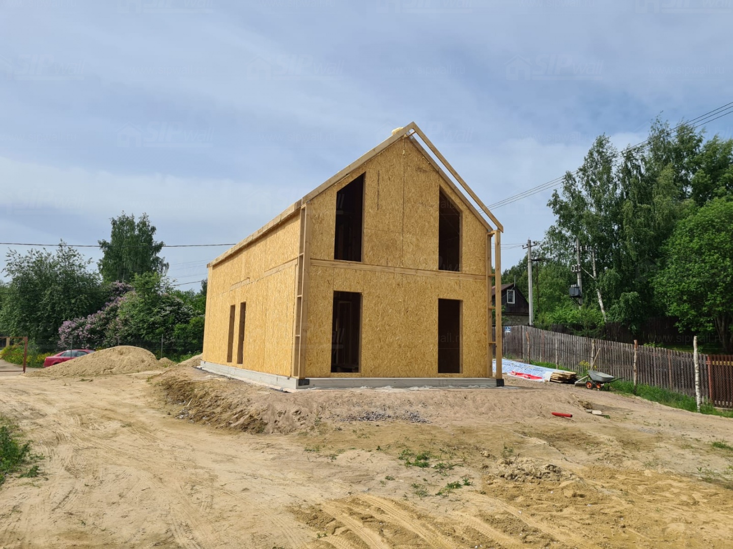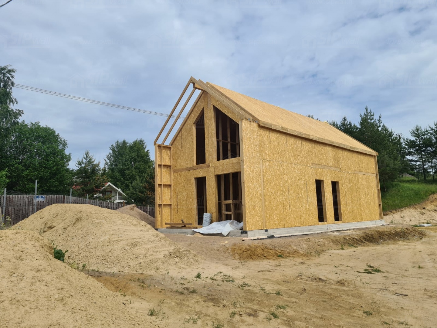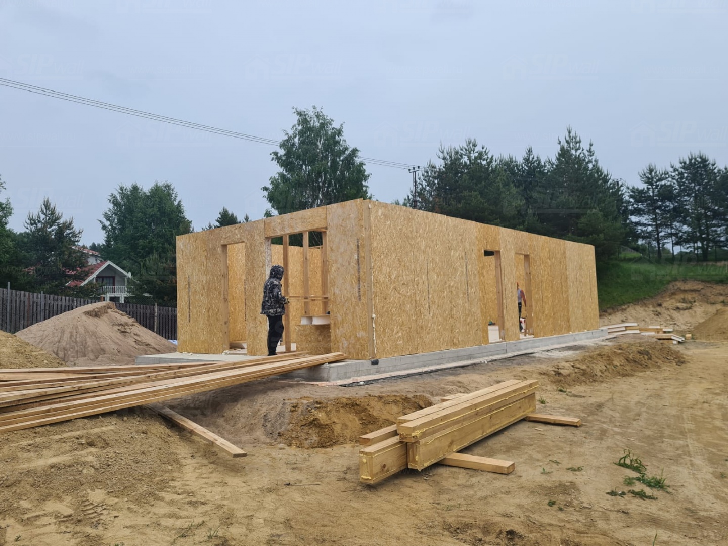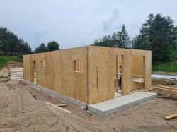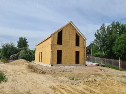 Все СИП панели SIPwall толщиной 224/174/124 мм (плиты OSB-3 толщиной 12 мм "Калевала" Россия и фасадный пенополистирол ППС-14 толщиной 200/150/100 мм производства, Россия) нарезаны и обрусованы сухим строганным брусом камерной сушки в соответствии с проектной документацией.