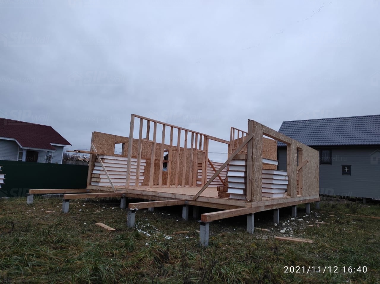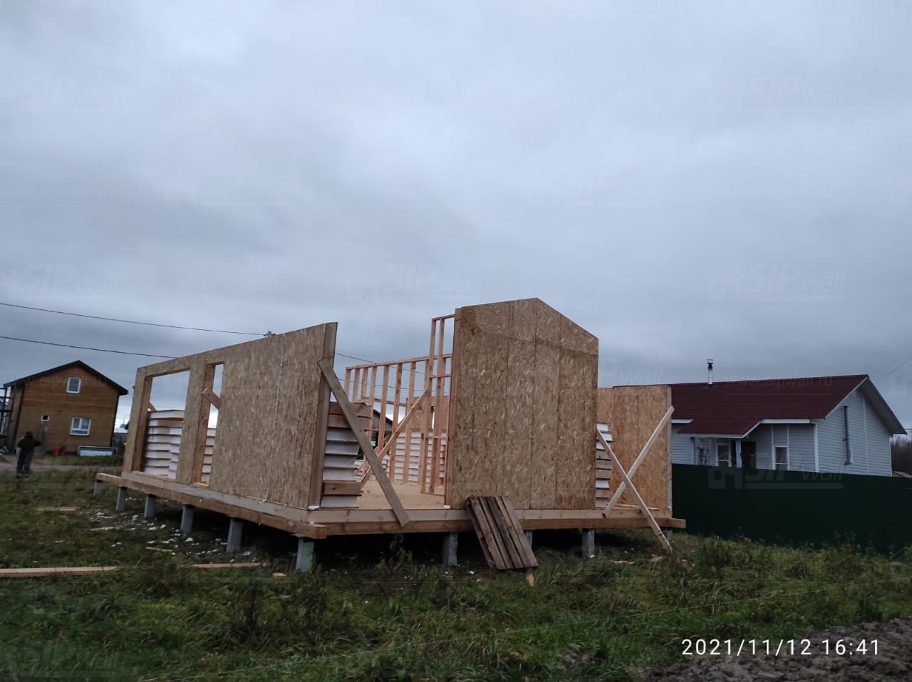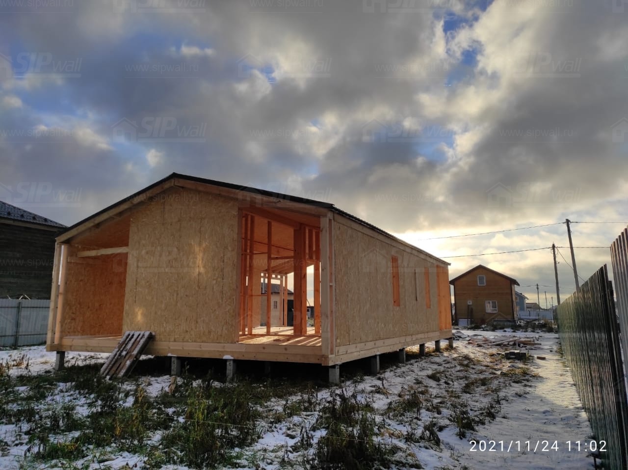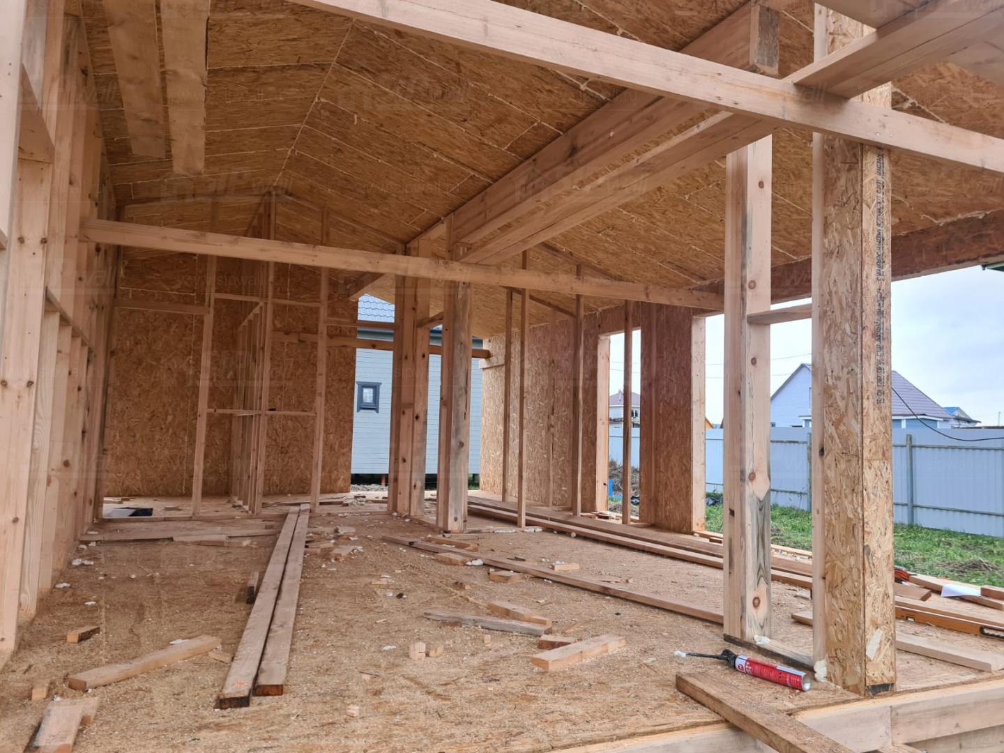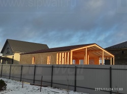 Все СИП панели SIPwall толщиной 224/174/124 мм (плиты OSB-3 толщиной 12 мм "Калевала" Россия и фасадный пенополистирол ППС-14 толщиной 200/150/100 мм производства, Россия) нарезаны и обрусованы сухим строганным брусом камерной сушки в соответствии с проектной документацией.