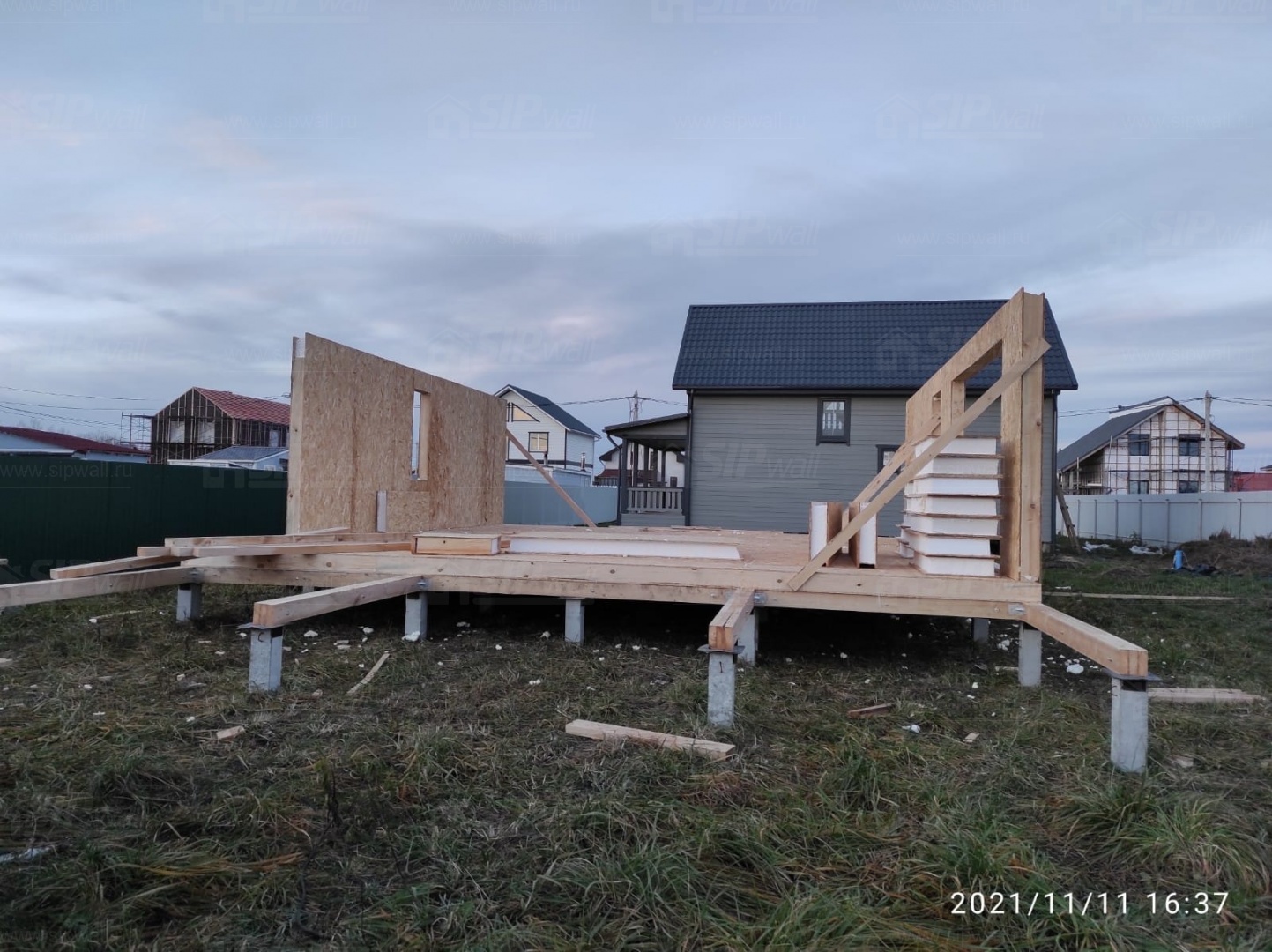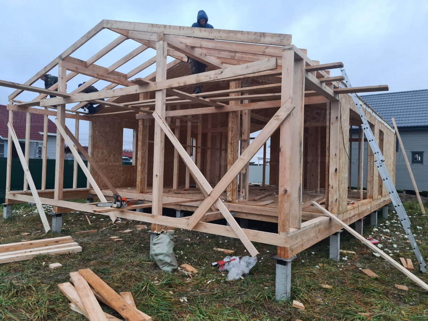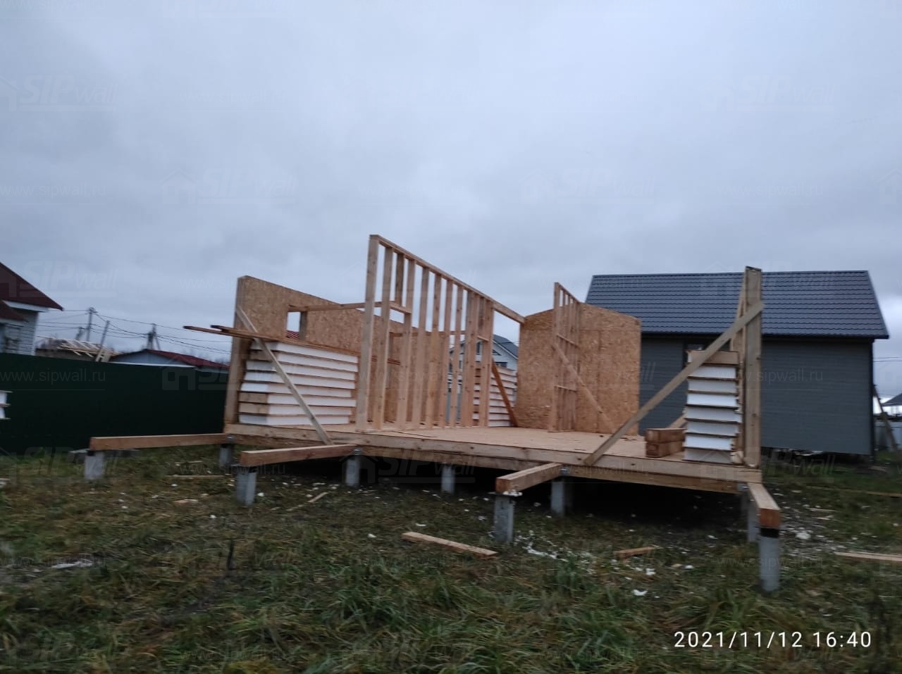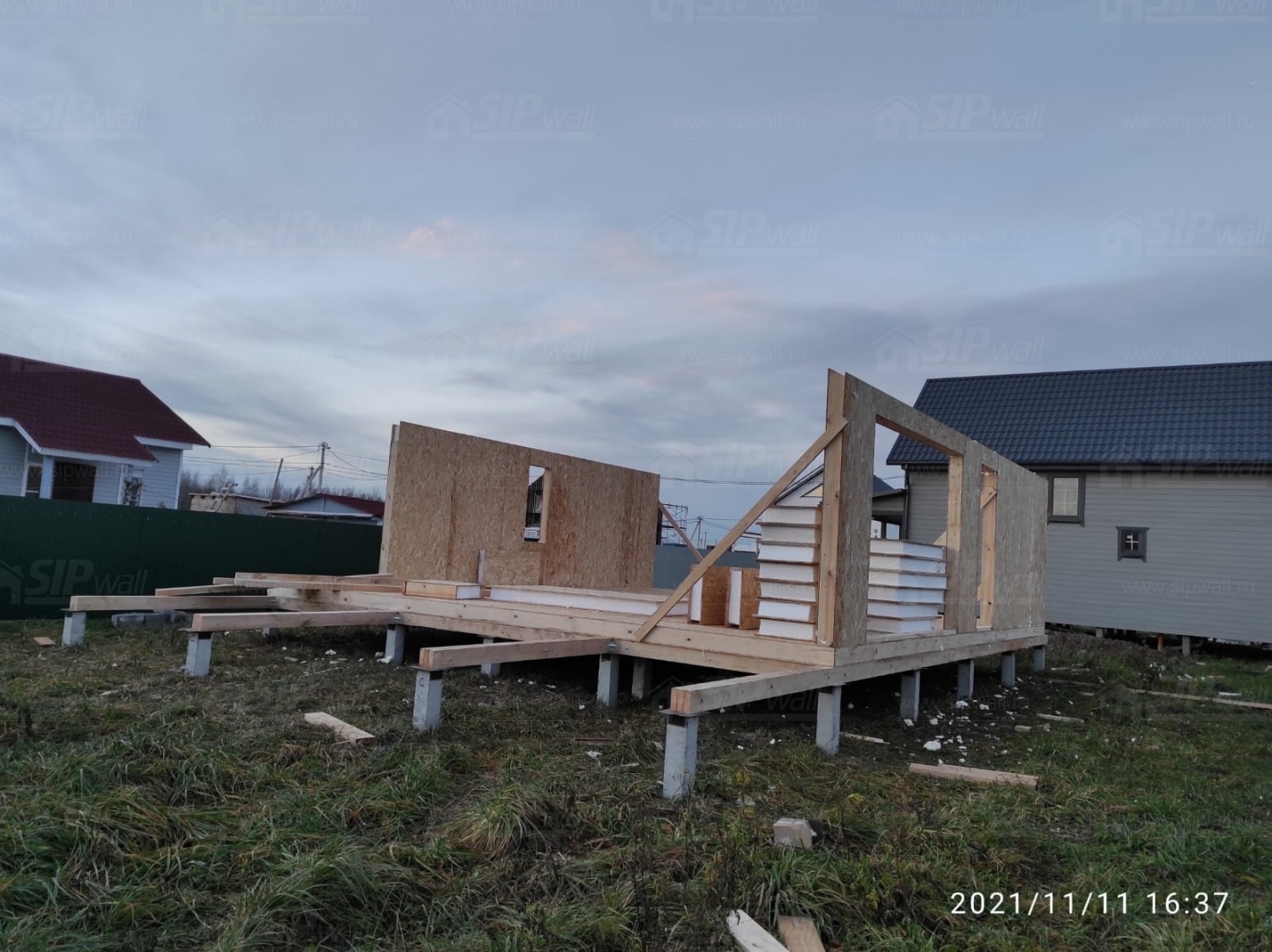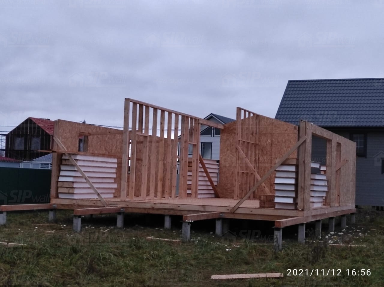 Все СИП панели SIPwall толщиной 224/174/124 мм (плиты OSB-3 толщиной 12 мм "Калевала" Россия и фасадный пенополистирол ППС-14 толщиной 200/150/100 мм производства, Россия) нарезаны и обрусованы сухим строганным брусом камерной сушки в соответствии с проектной документацией.