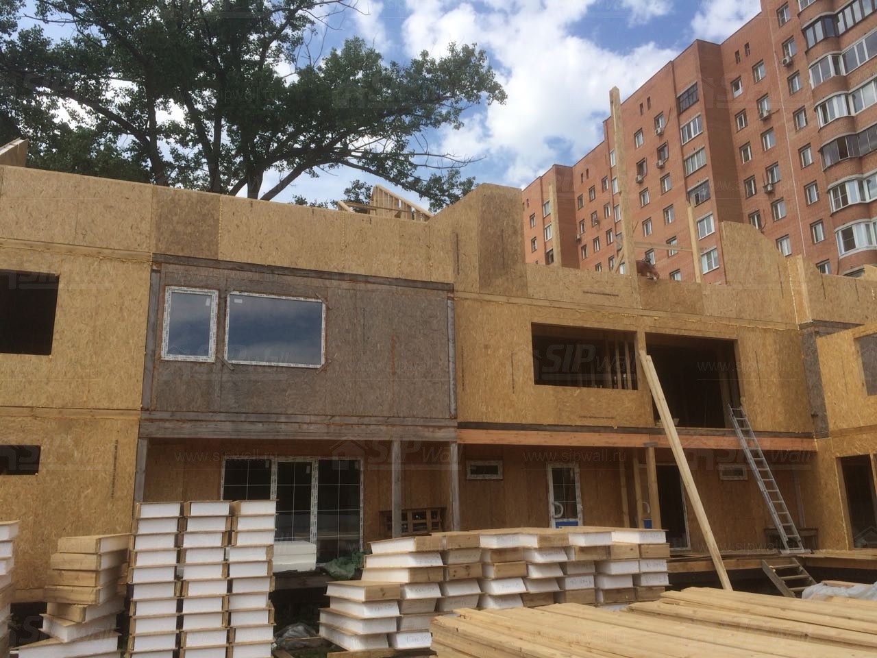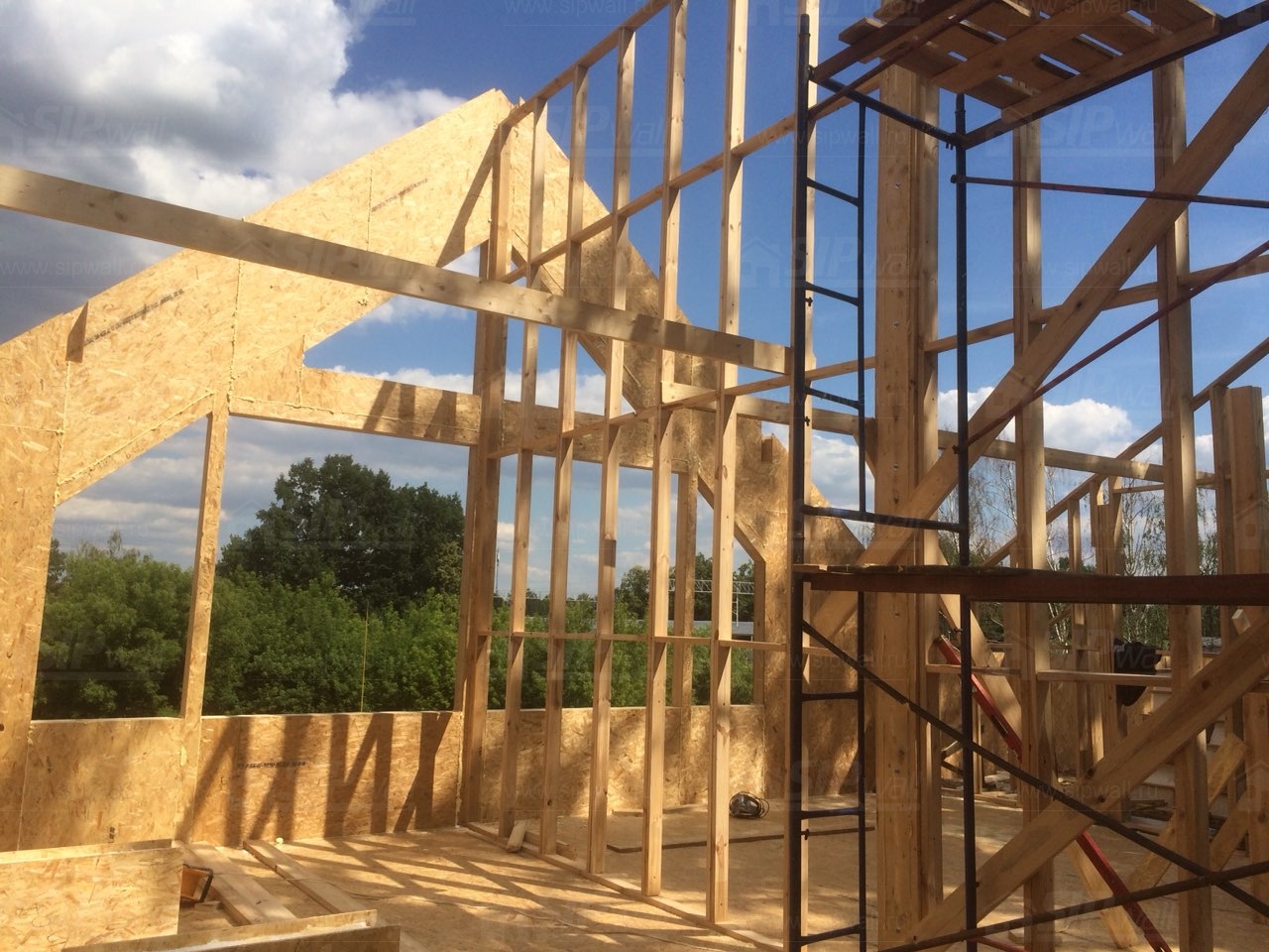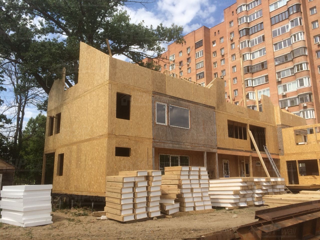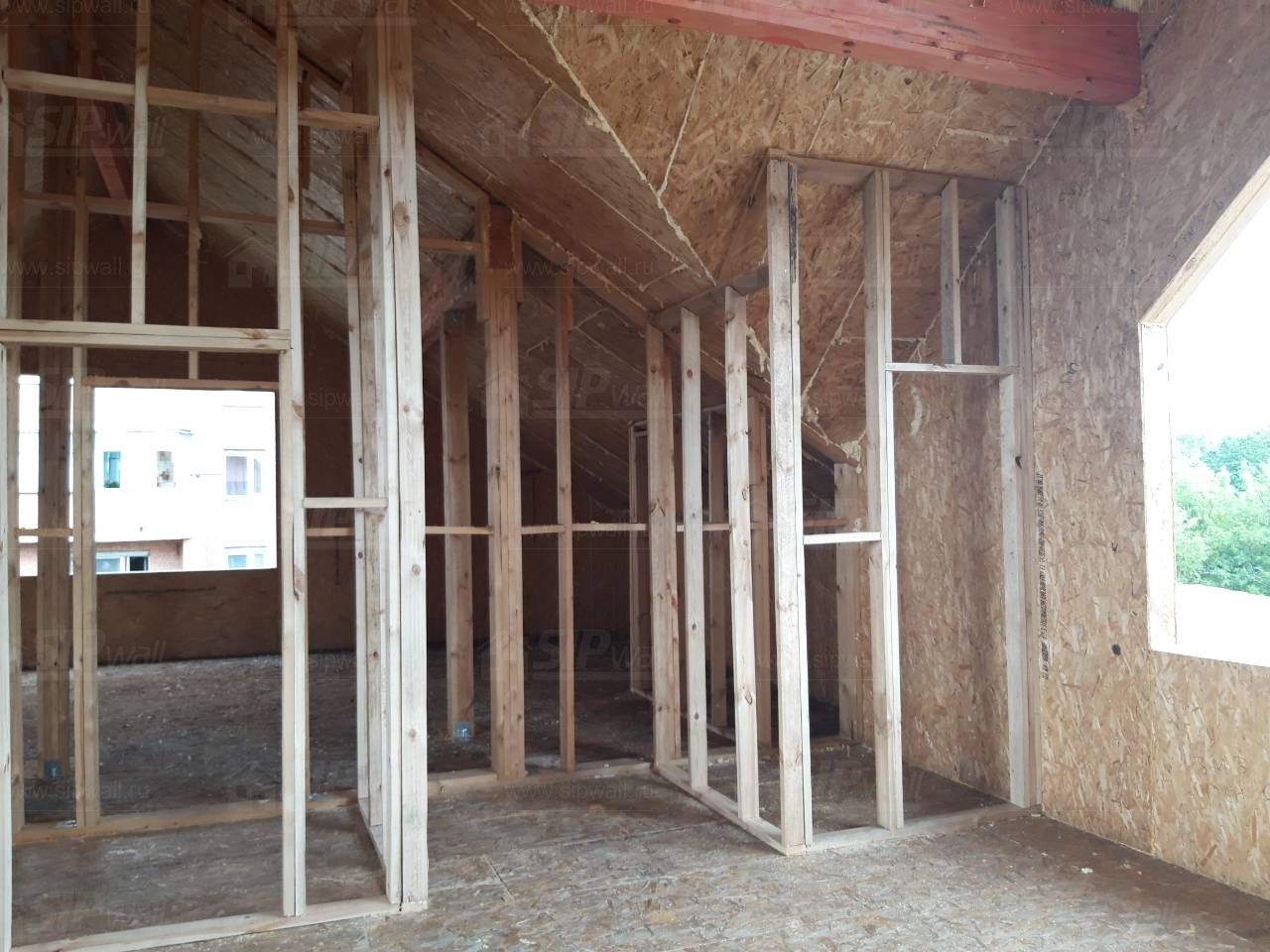 Все СИП панели SIPwall толщиной 224/174/124 мм (плиты OSB-3 толщиной 12 мм "Калевала" Россия и фасадный пенополистирол ПСБ-С 25 по ГОСТ 15588-14 толщиной 200/150/100 мм производства завода "PolarPlast", Россия) нарезаны и обрусованы сухим строганным брусом камерной сушки в соответствии с проектной документацией.