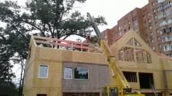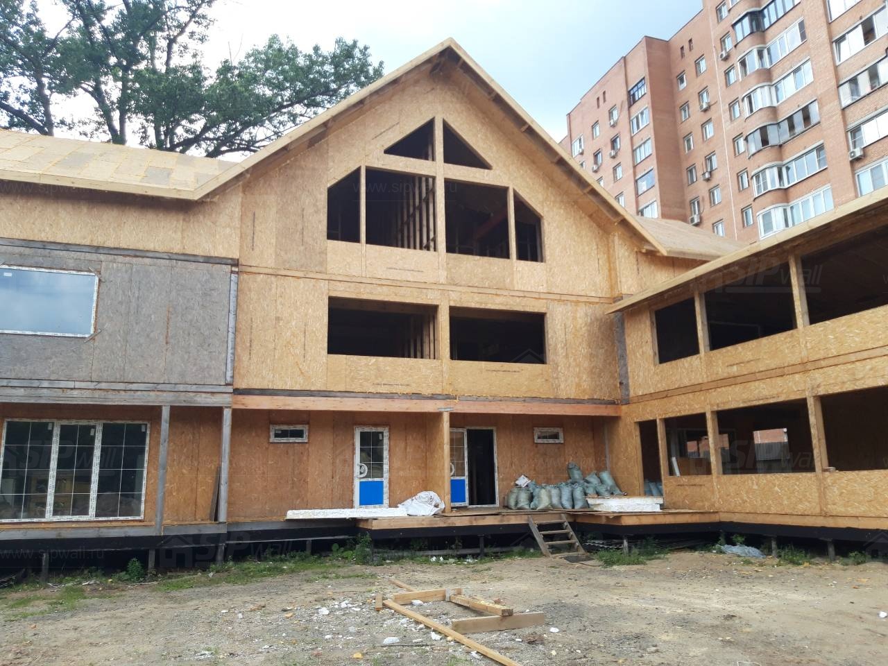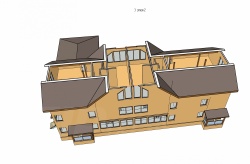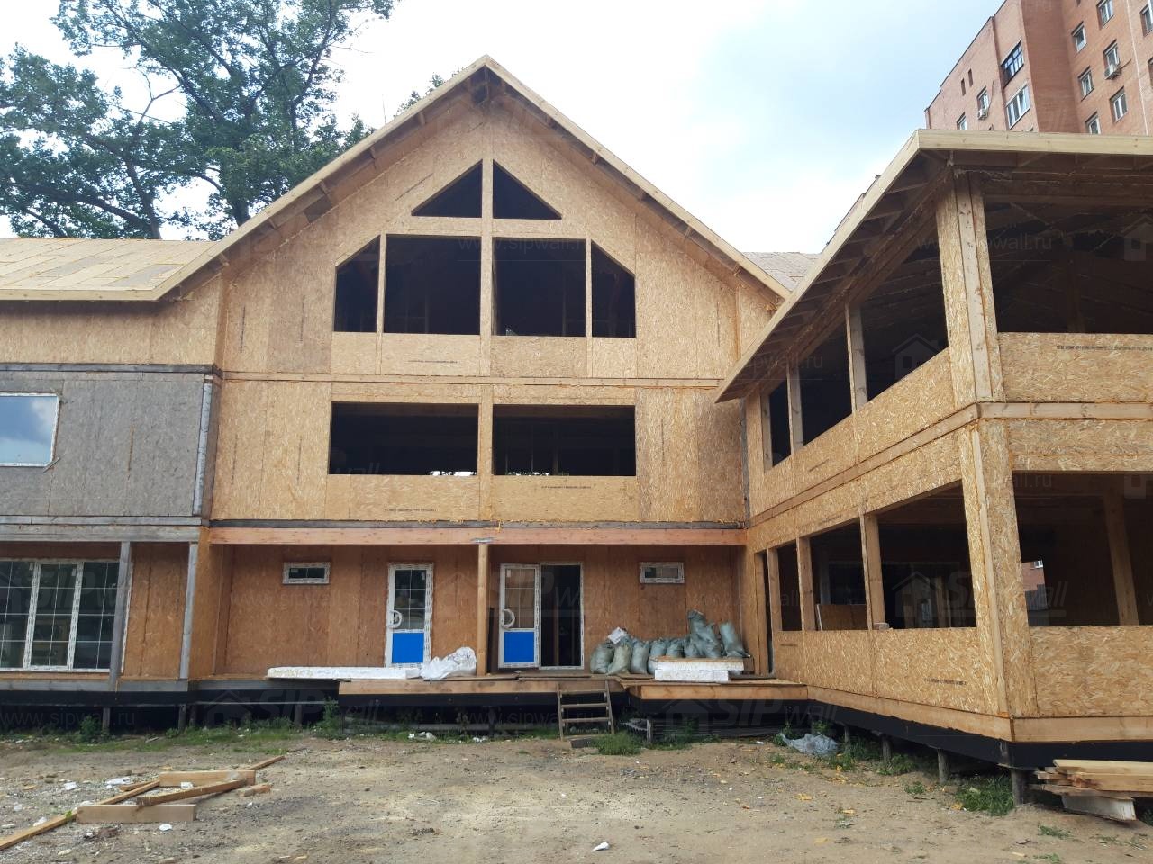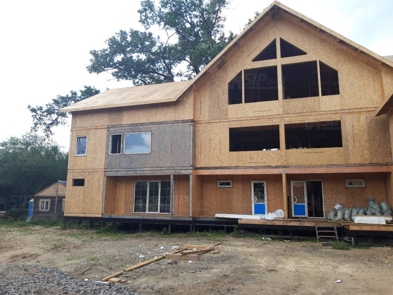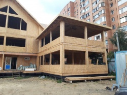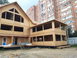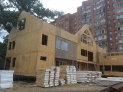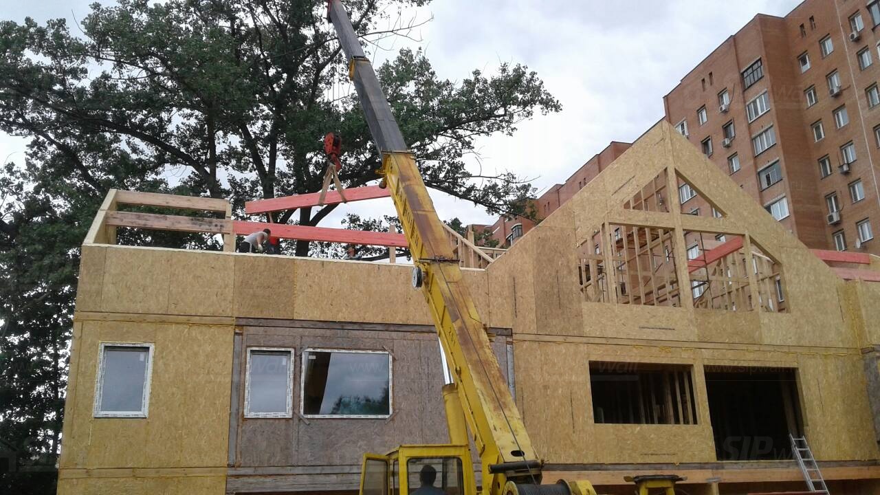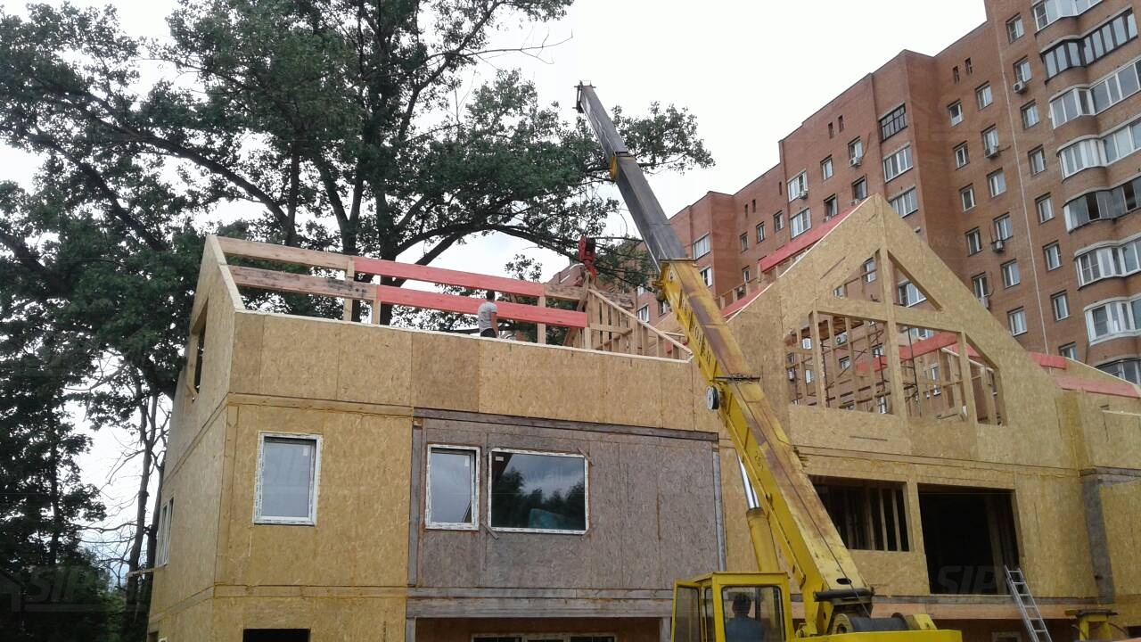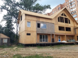 Комплектация домокомплекта: перекрытие на отметке +0.000 - СИП 224У мм., несущие стены дома выполнены из СИП панелей 174 мм., внутренние несущие стены и внутренние не несущие перегородки выполнены по каркасной технологии. Перекрытие межэтажное - выполнено из СИП панелей 174У мм. Кровля - выполнена из СИП панелей