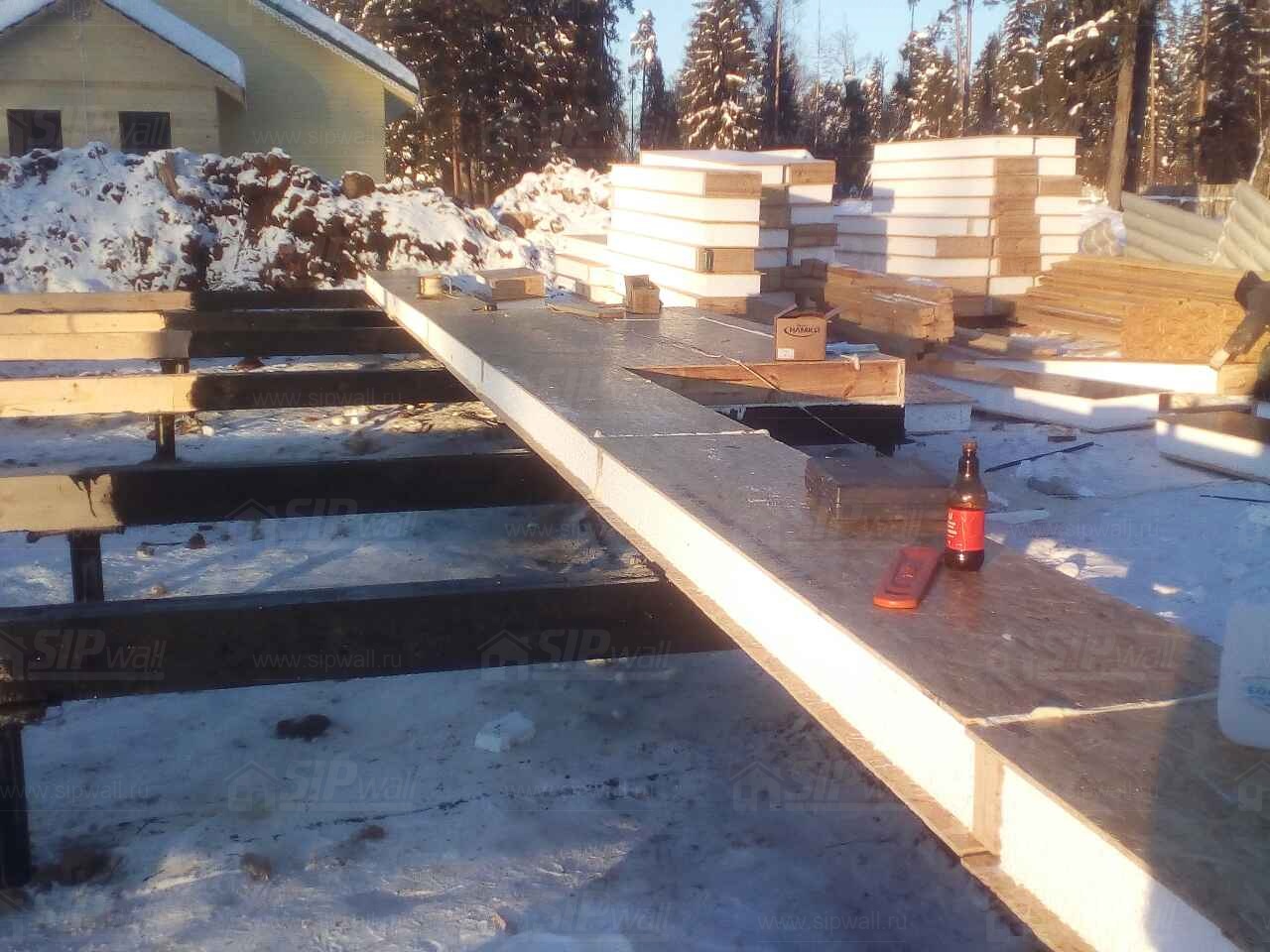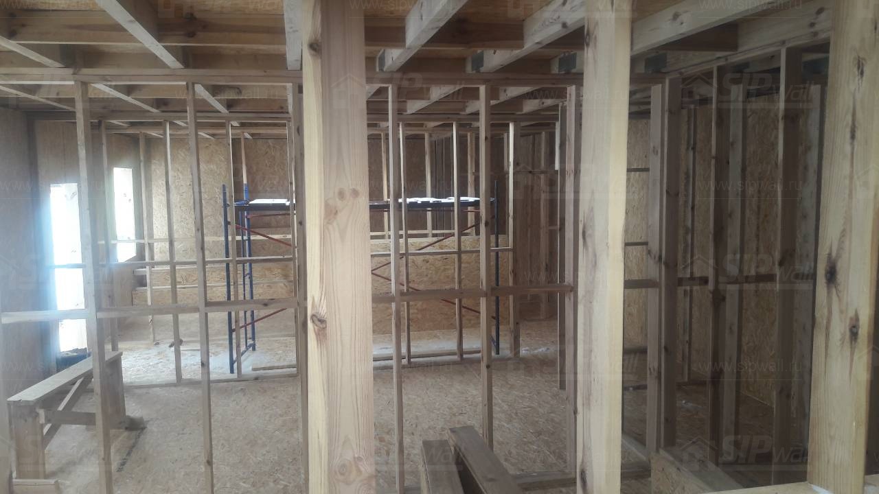 Все СИП панели SIPwall толщиной 224/174/124 мм (плиты OSB-3 толщиной 12 мм "Калевала" Россия и фасадный пенополистирол ПСБ-С 25 по ГОСТ 15588-14 толщиной 200/150/100 мм производства завода "PolarPlast", Россия) нарезаны и обрусованы сухим строганным брусом камерной сушки в соответствии с проектной документацией.