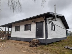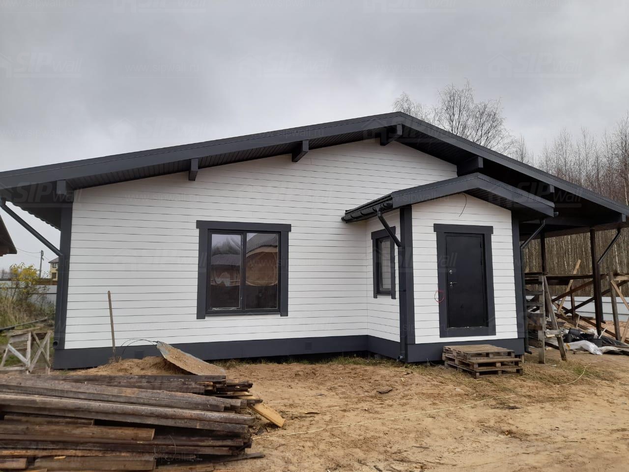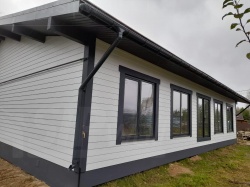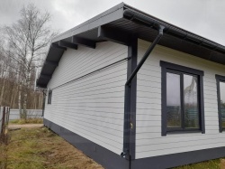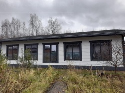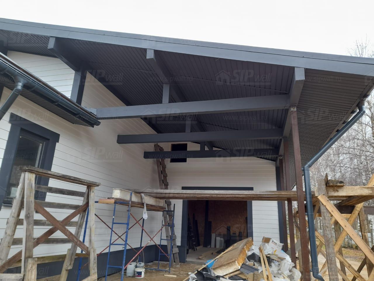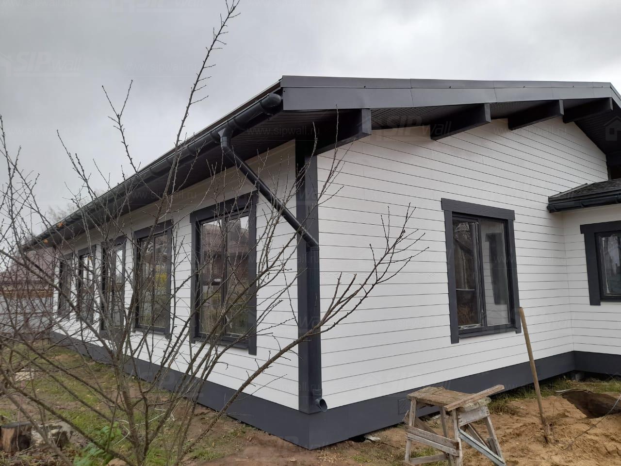 Финальный этап включал внешнюю отделку здания с использованием фиброцементных панелей, что придает сооружению стильный и современный вид, а также обеспечивает высокую долговечность и защиту от воздействия внешней среды.