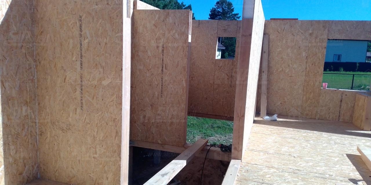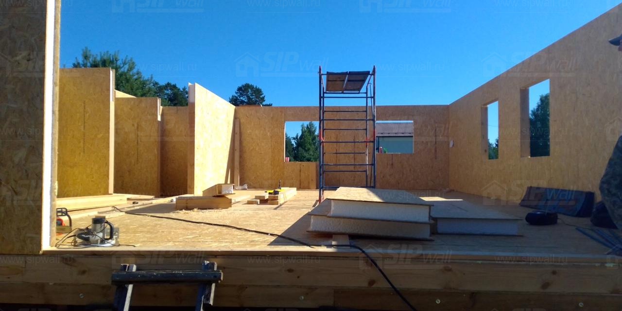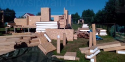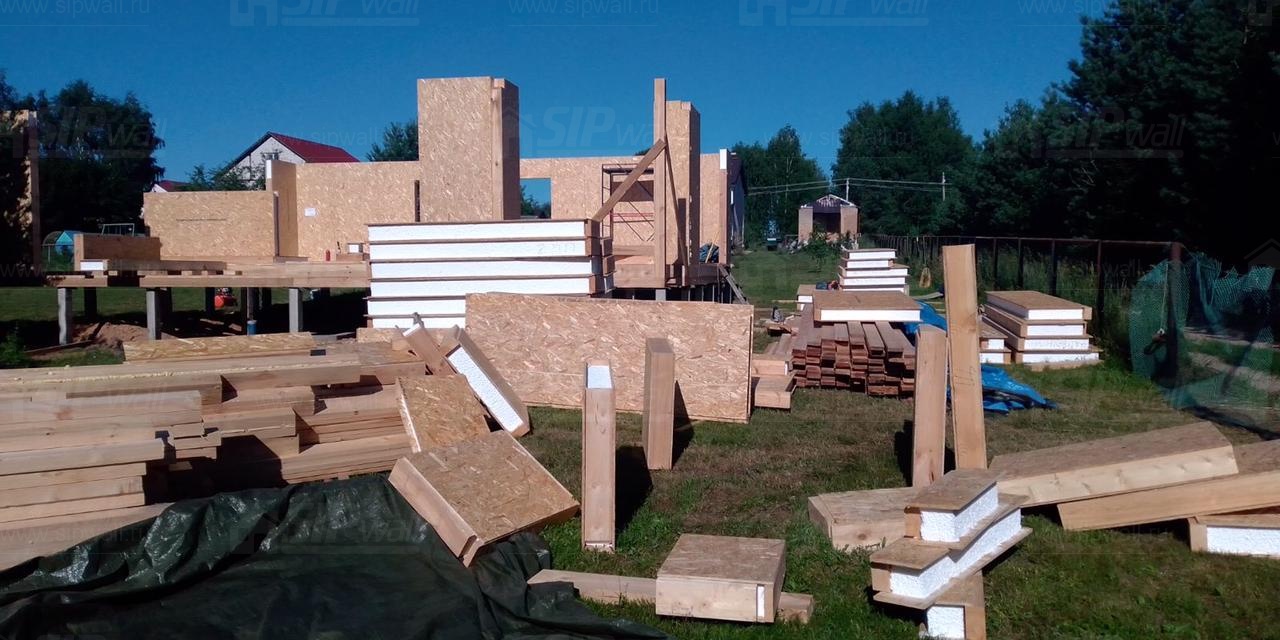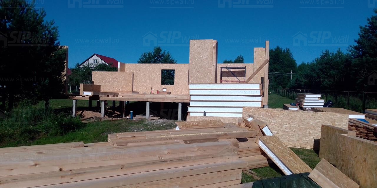 Все СИП панели SIPwall толщиной 224/174/124 мм (плиты OSB-3 толщиной 12 мм "Калевала" Россия и фасадный пенополистирол ППС-14 толщиной 200/150/100 мм производства, Россия) нарезаны и обрусованы сухим строганным брусом камерной сушки в соответствии с проектной документацией.