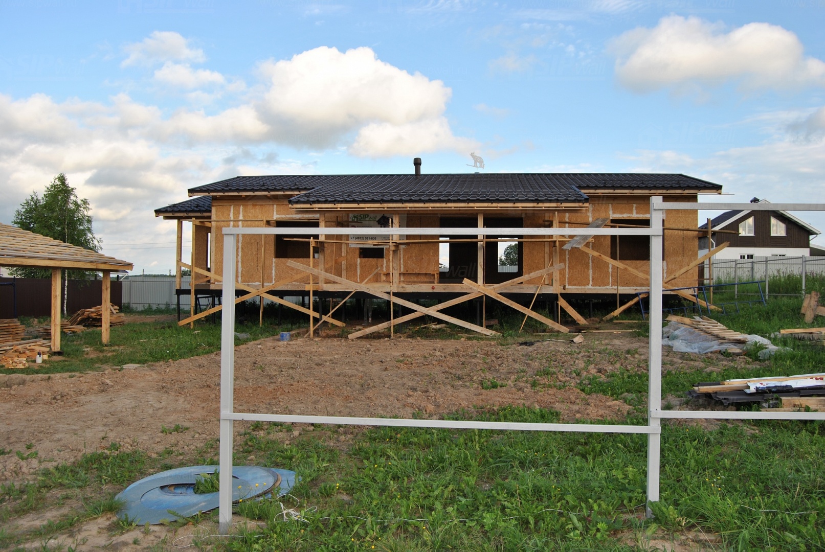 Комплектация: нулевое перекрытие -выполнены из СИП панелей 224 мм, несущие стены дома выполнены из СИП панелей 174 мм., внутренние несущие стены из СИП панелей - 174 мм, внутренние не несущие перегородки - СИП панели - 124 мм. Кровля - выполнена из СИП панелей 224 мм производства компании СИПВОЛЛ.
