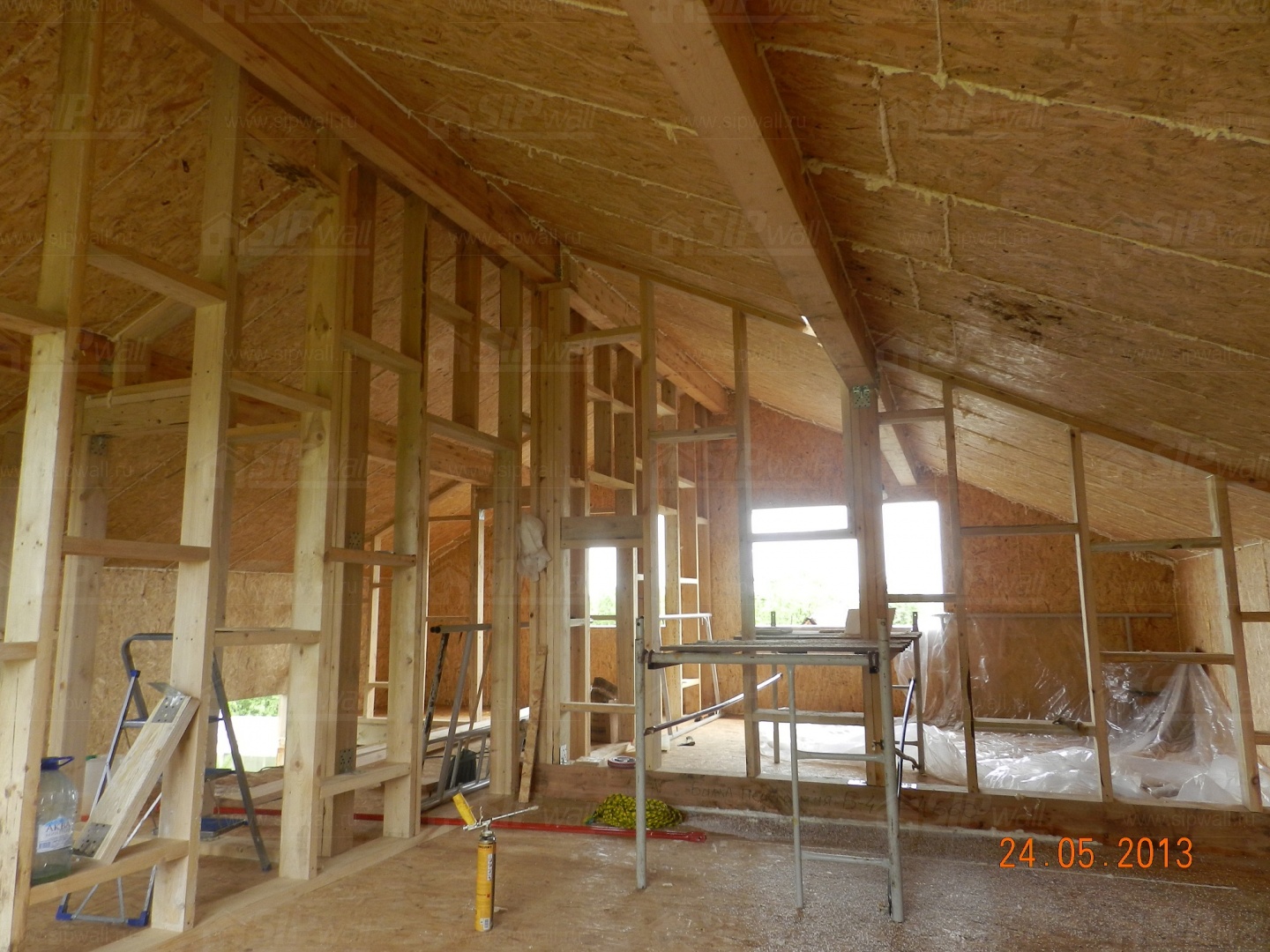 Все СИП панели SIPwall толщиной 224/174/124 мм (плиты OSB-3 толщиной 12 мм "Калевала" Россия и фасадный пенополистирол ПСБ-С 25 по ГОСТ 15588-14 толщиной 200/150/100 мм производства завода "PolarPlast", Россия) нарезаны и обрусованы сухим строганным брусом камерной сушки в соответствии с проектной документацией.