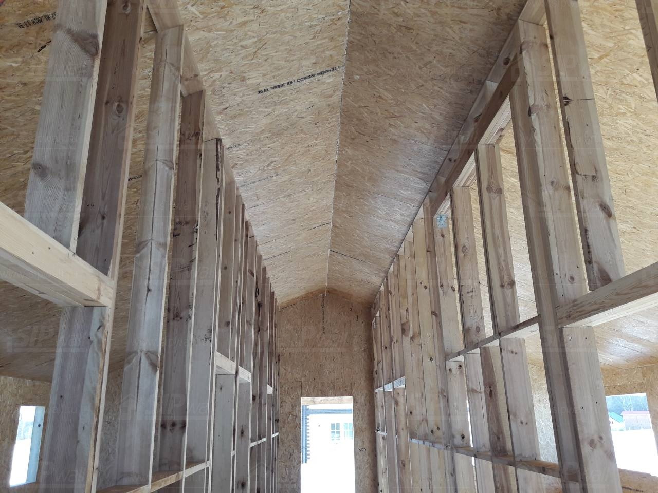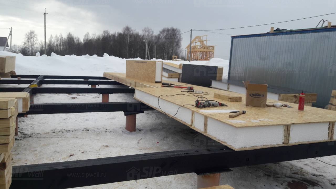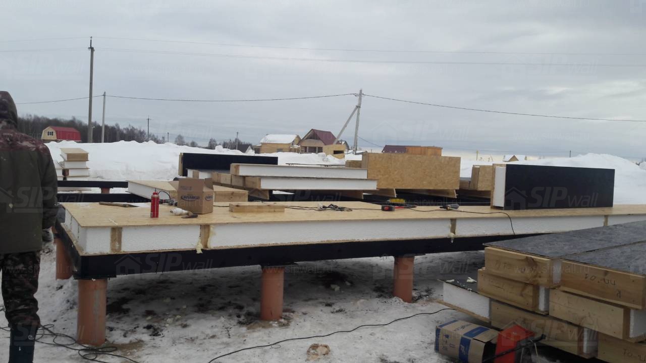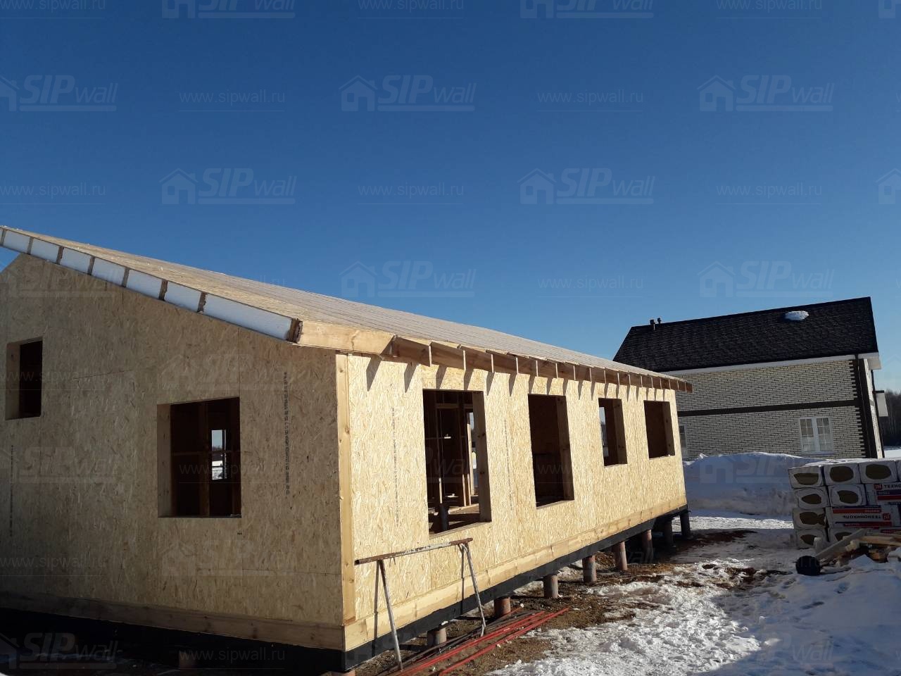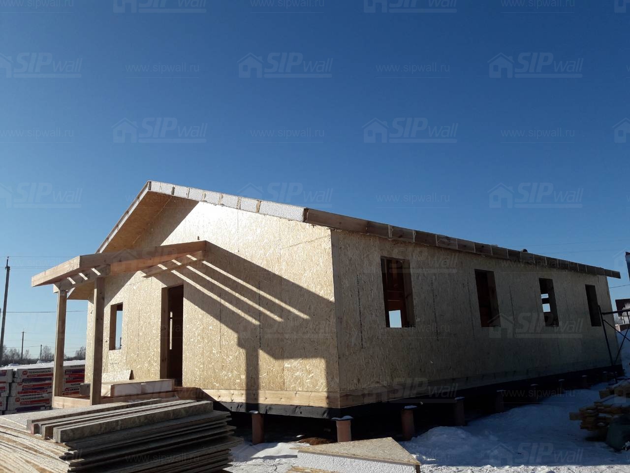 Все СИП панели SIPwall толщиной 224/174/124 мм (плиты OSB-3 толщиной 12 мм "Калевала" Россия и фасадный пенополистирол ПСБ-С 25 по ГОСТ 15588-14 толщиной 200/150/100 мм производства завода "PolarPlast", Россия) нарезаны и обрусованы сухим строганным брусом камерной сушки в соответствии с проектной документацией.