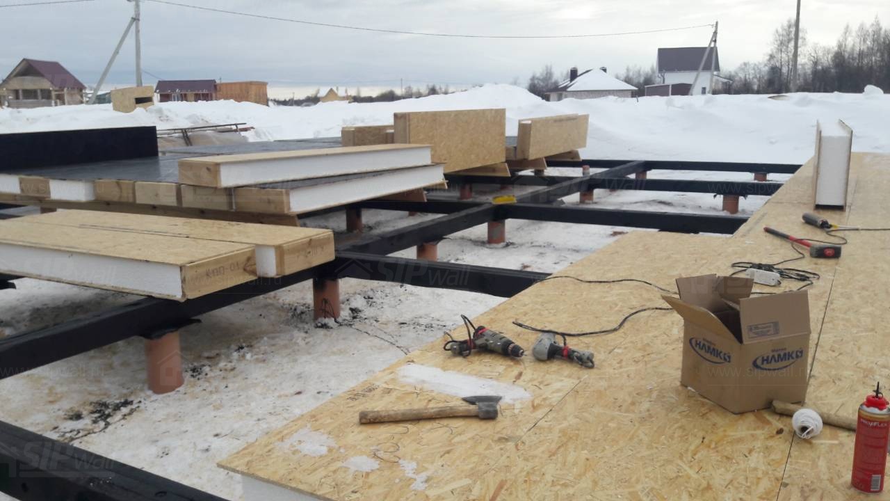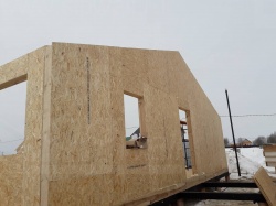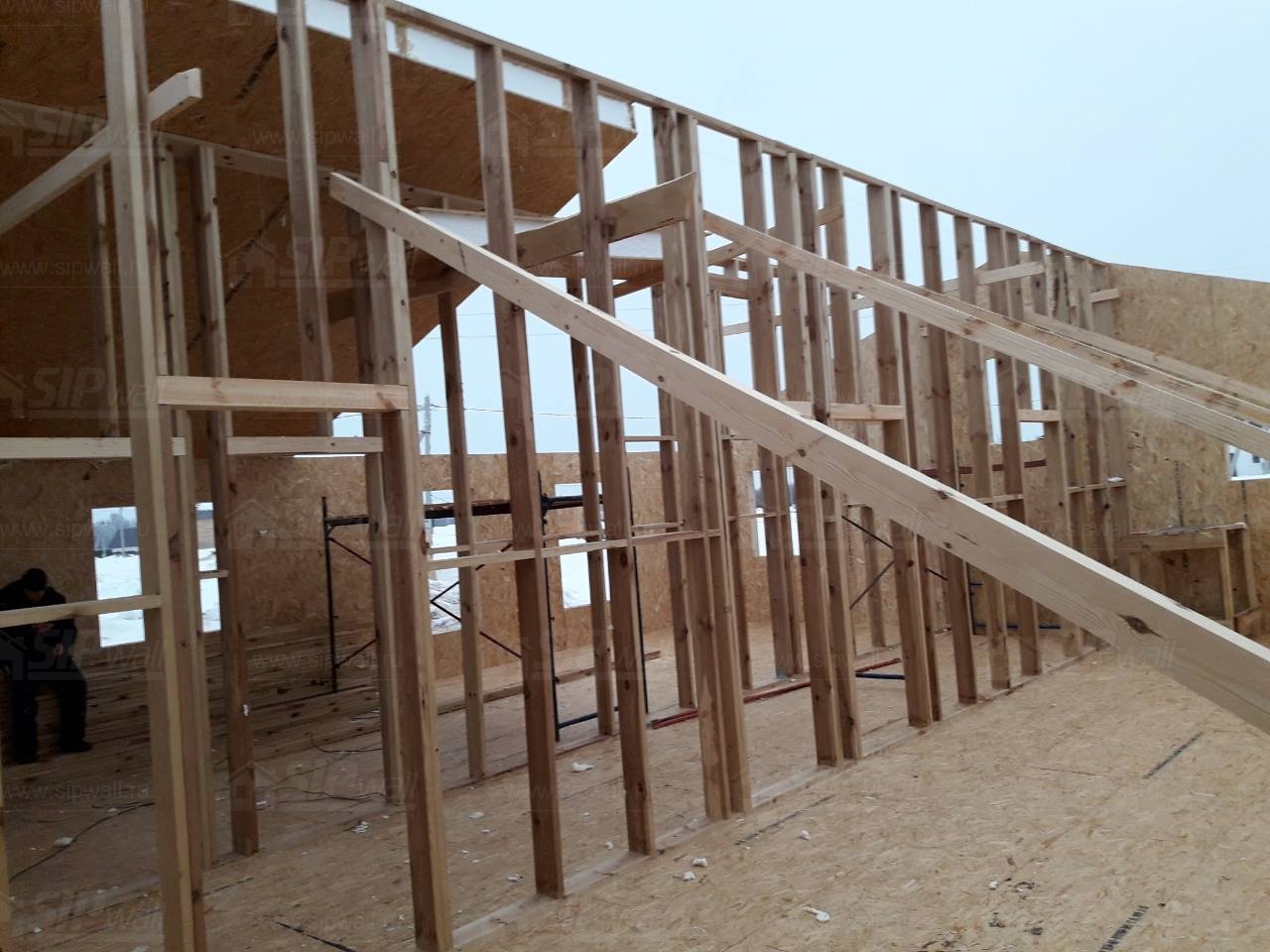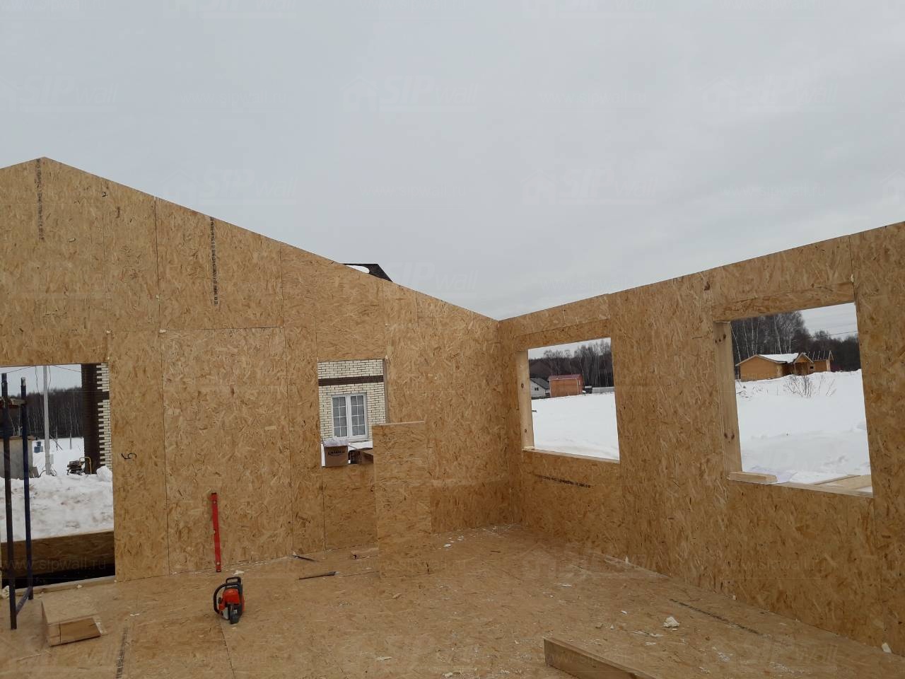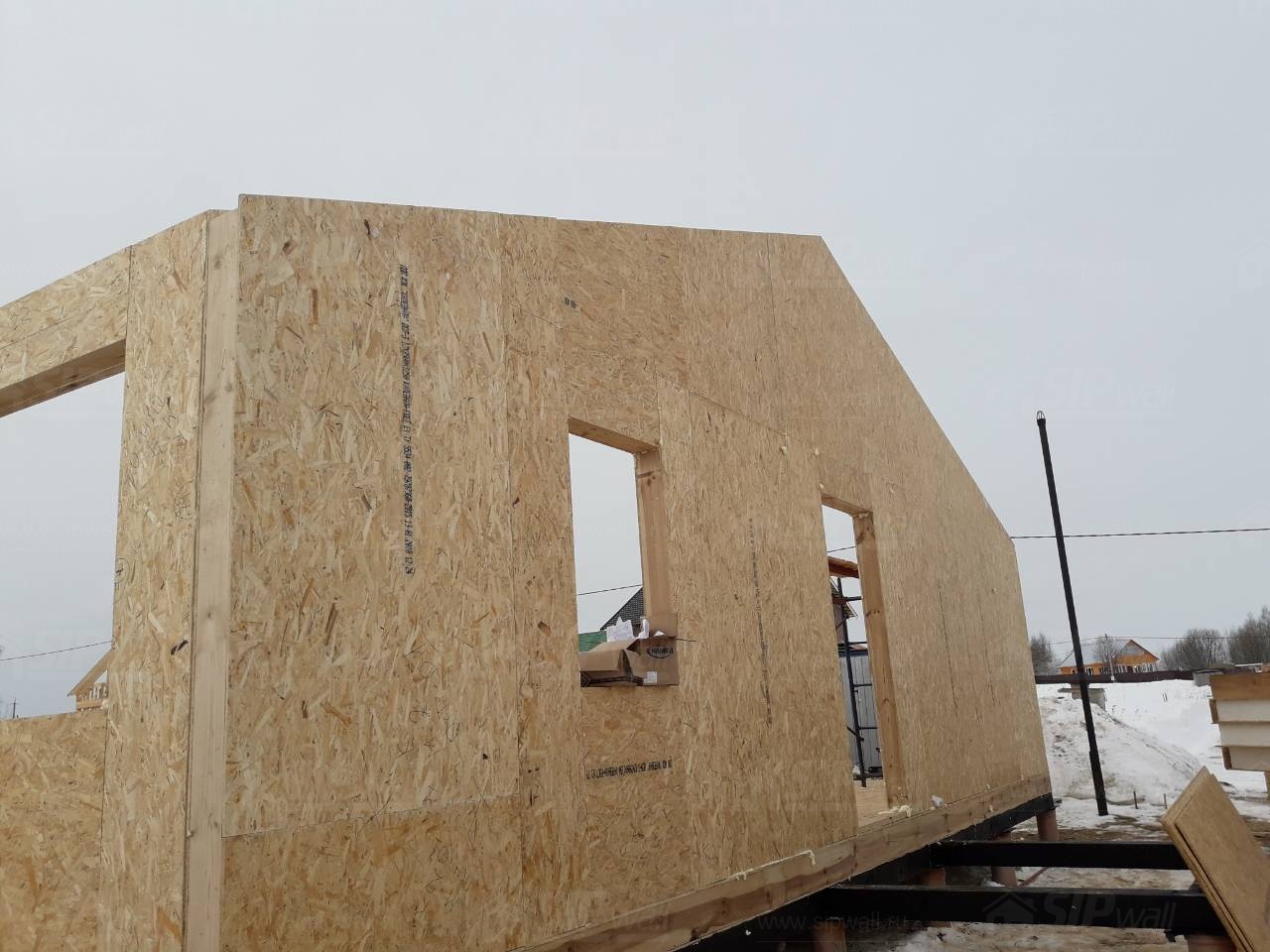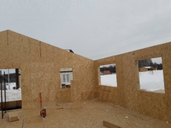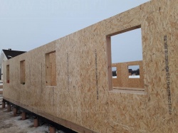 Все СИП панели SIPwall толщиной 224/174/124 мм (плиты OSB-3 толщиной 12 мм "Калевала" Россия и фасадный пенополистирол ПСБ-С 25 по ГОСТ 15588-14 толщиной 200/150/100 мм производства завода "PolarPlast", Россия) нарезаны и обрусованы сухим строганным брусом камерной сушки в соответствии с проектной документацией.