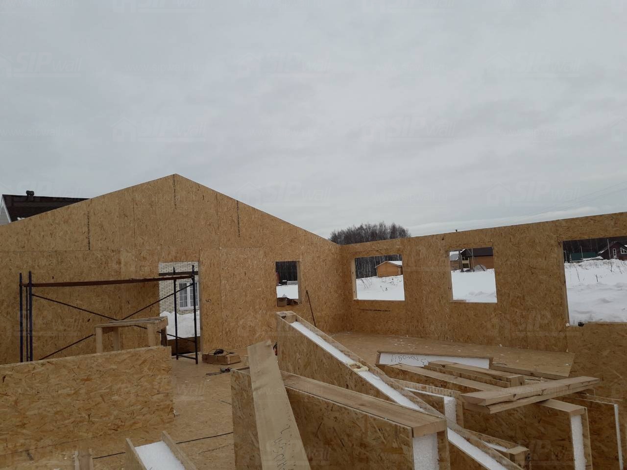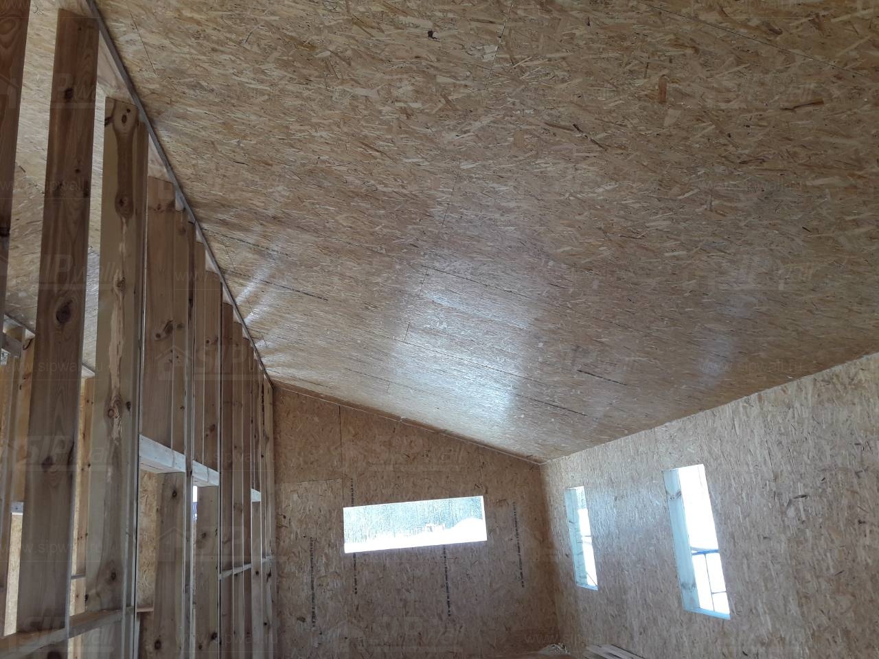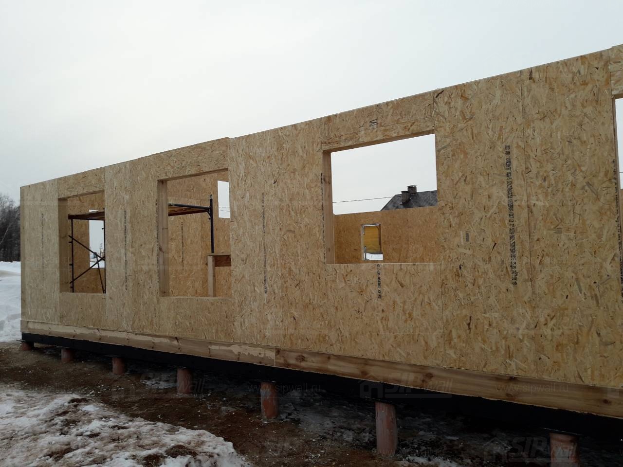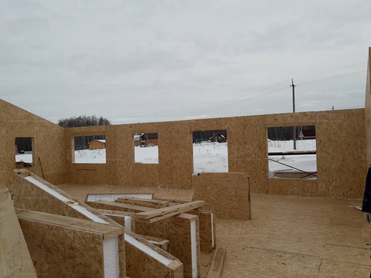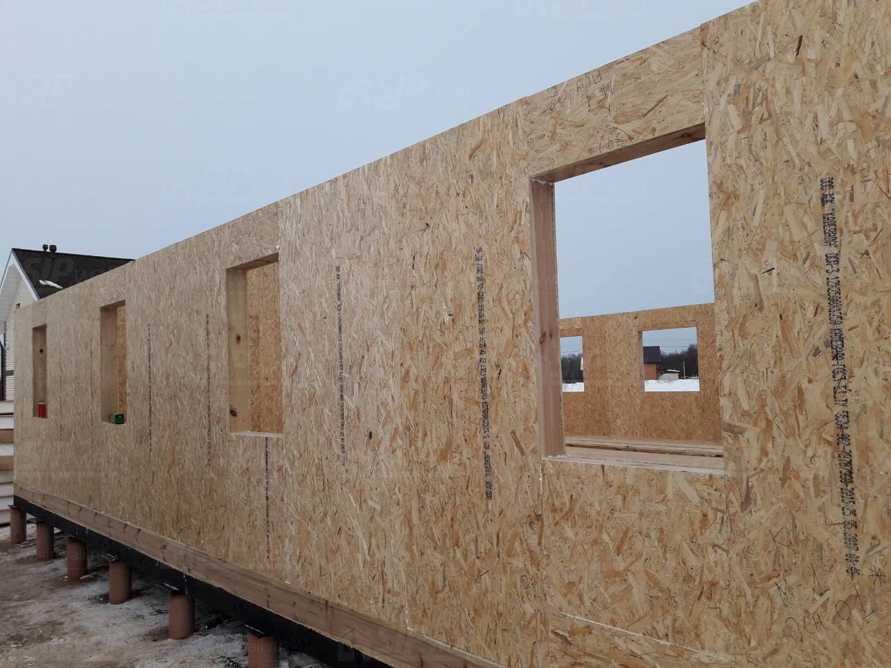 Все СИП панели SIPwall толщиной 224/174/124 мм (плиты OSB-3 толщиной 12 мм "Калевала" Россия и фасадный пенополистирол ПСБ-С 25 по ГОСТ 15588-14 толщиной 200/150/100 мм производства завода "PolarPlast", Россия) нарезаны и обрусованы сухим строганным брусом камерной сушки в соответствии с проектной документацией.