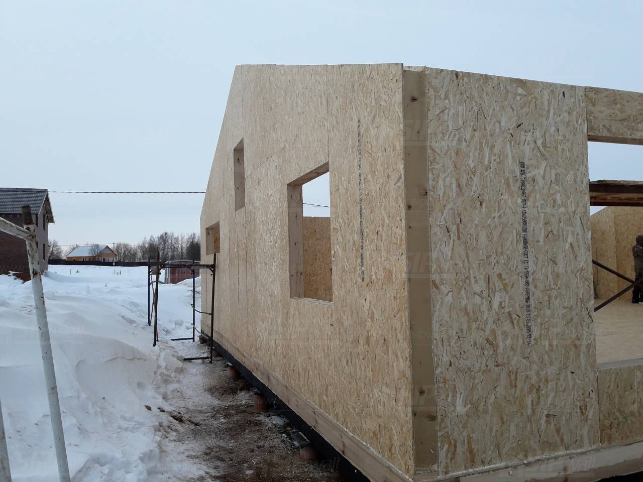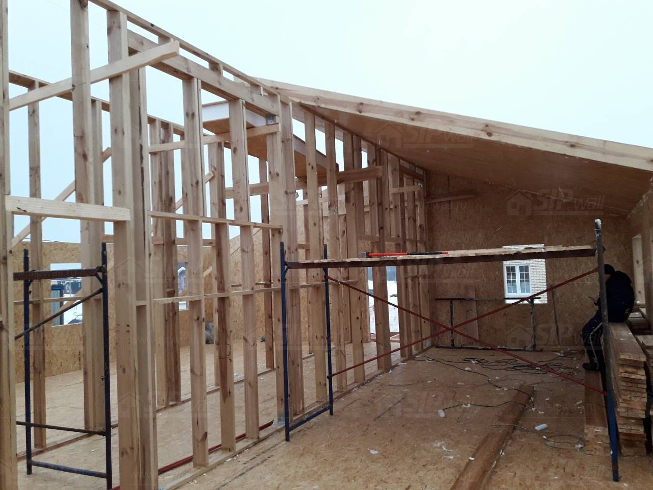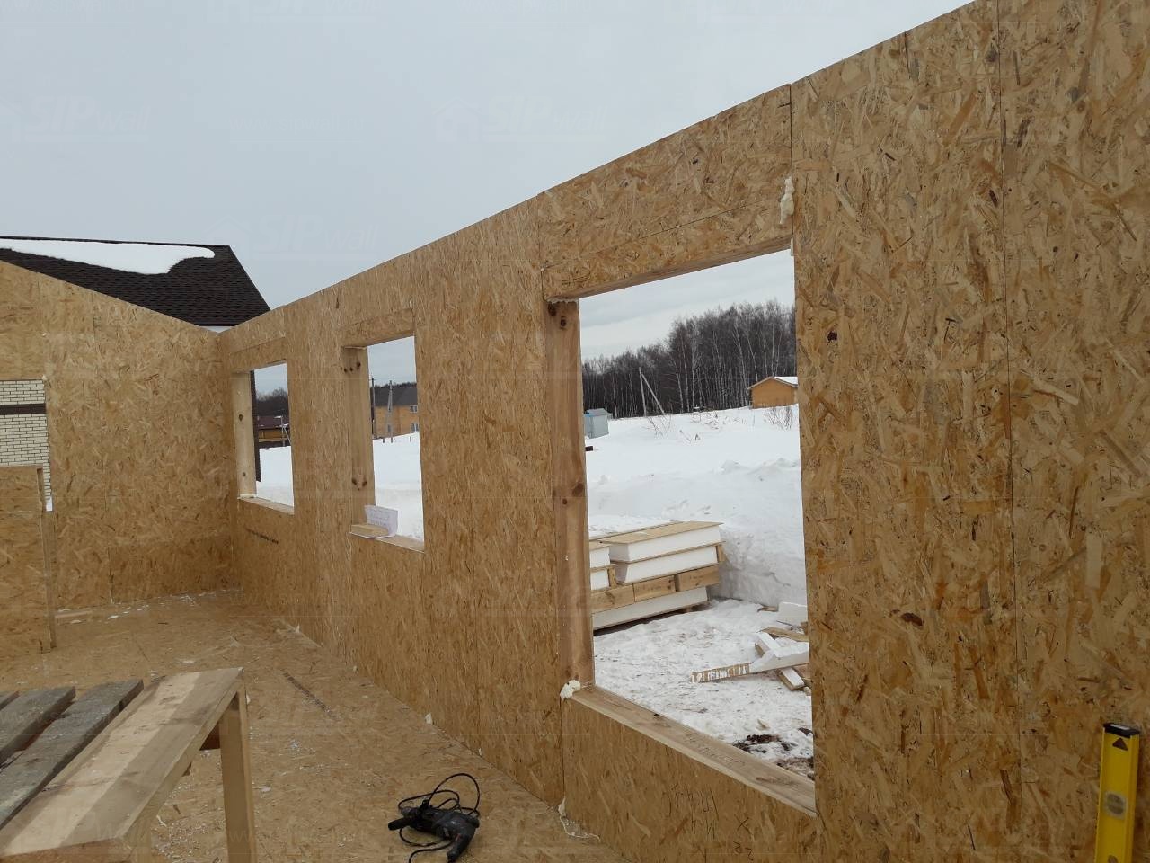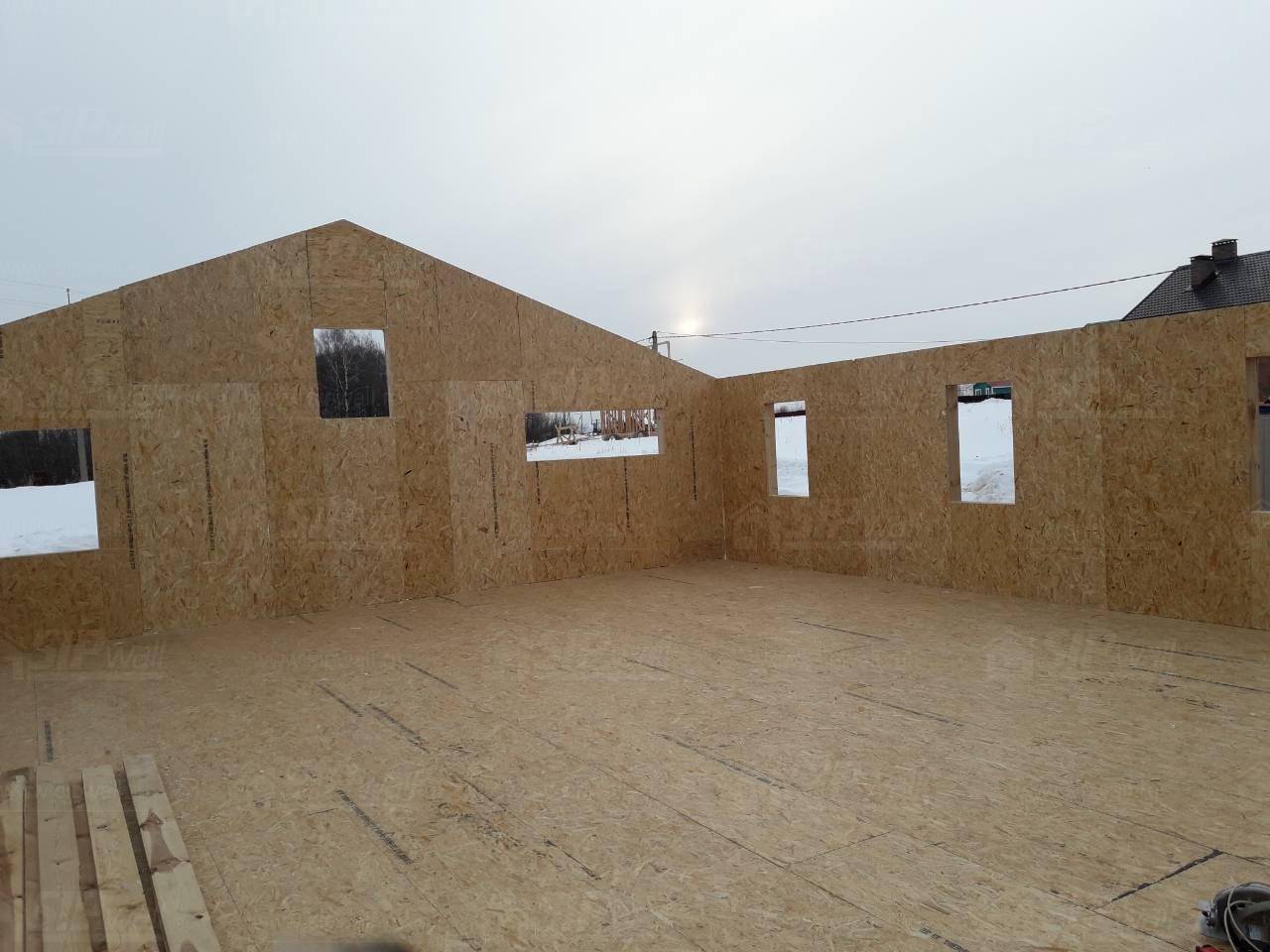 Все СИП панели SIPwall толщиной 224/174/124 мм (плиты OSB-3 толщиной 12 мм "Калевала" Россия и фасадный пенополистирол ПСБ-С 25 по ГОСТ 15588-14 толщиной 200/150/100 мм производства завода "PolarPlast", Россия) нарезаны и обрусованы сухим строганным брусом камерной сушки в соответствии с проектной документацией.