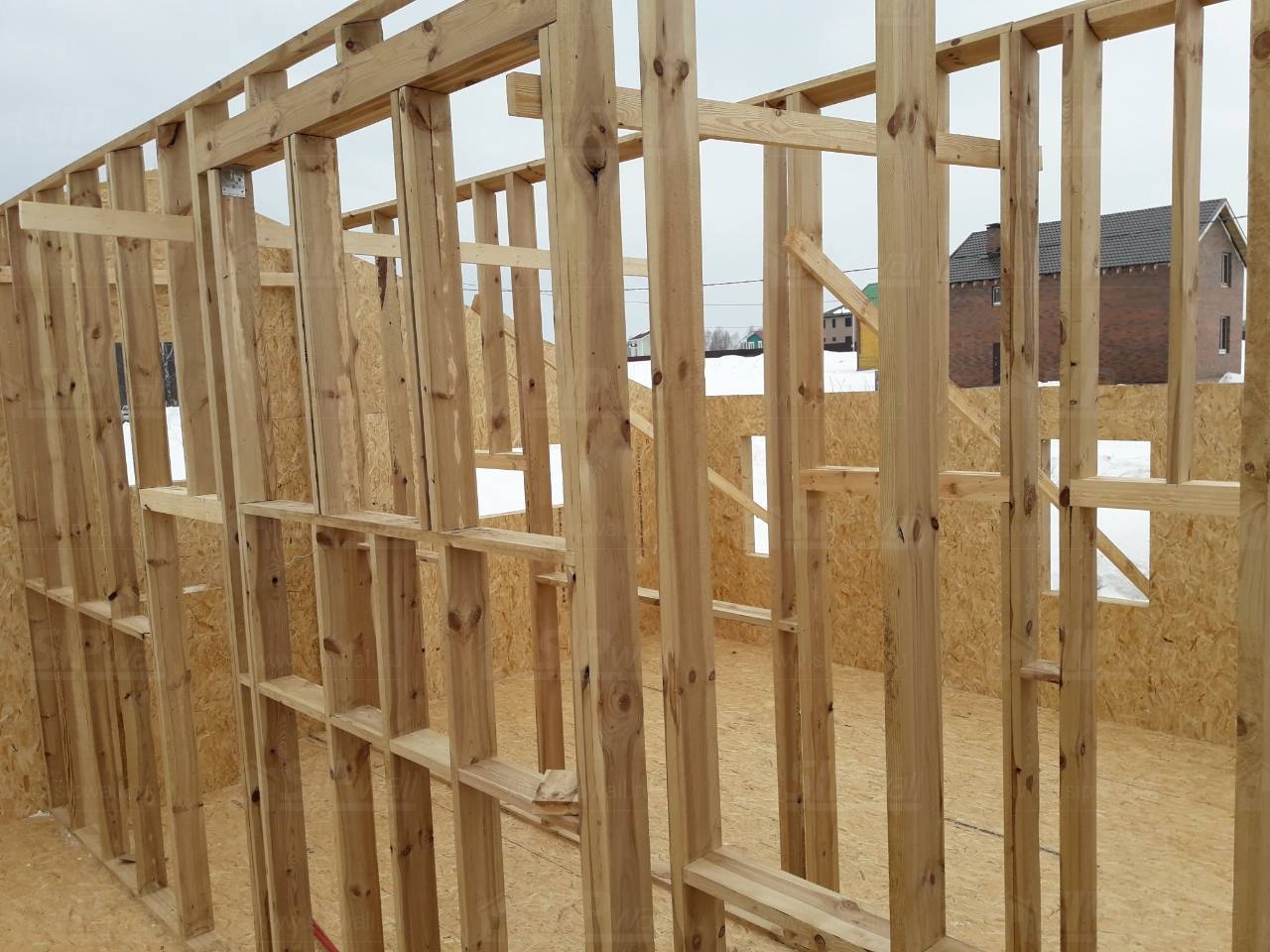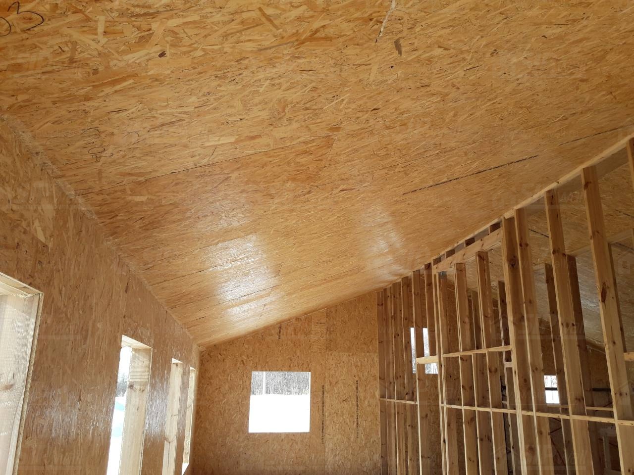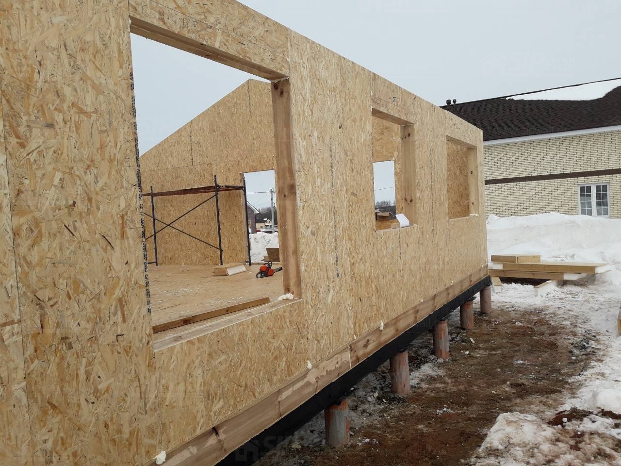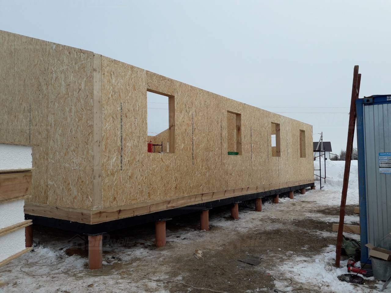 Все СИП панели SIPwall толщиной 224/174/124 мм (плиты OSB-3 толщиной 12 мм "Калевала" Россия и фасадный пенополистирол ПСБ-С 25 по ГОСТ 15588-14 толщиной 200/150/100 мм производства завода "PolarPlast", Россия) нарезаны и обрусованы сухим строганным брусом камерной сушки в соответствии с проектной документацией.