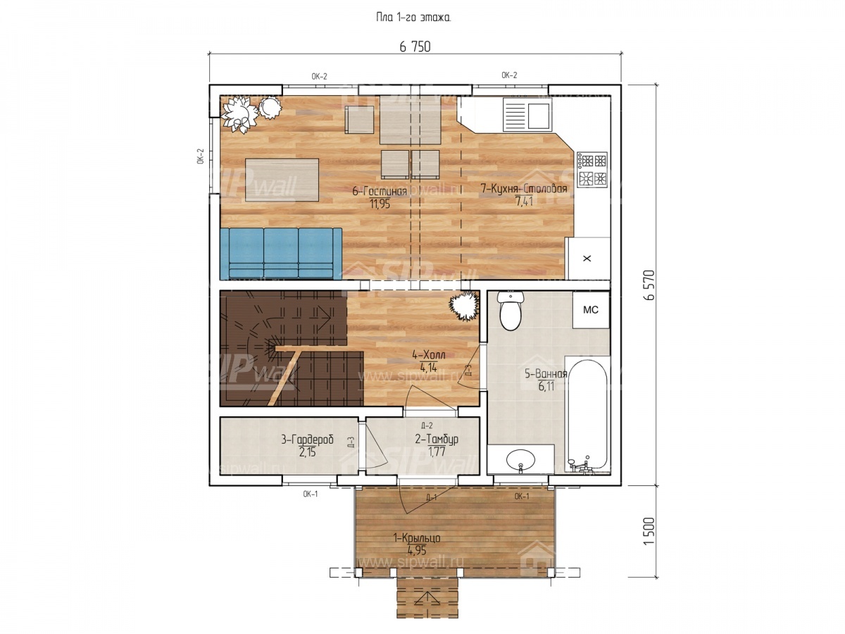 Домокомплект - изготовлен по проекту из СИП панелей произведенный по технологии SIPwall (ЭКОПАН) на собственном заводе расположенном в г. Шуя, Ивановской области. При изготовлении домокомплекта панельно каркасного дома используется только сухой строганный брус камерной сушки, обработанный огнебиозащитным составом.