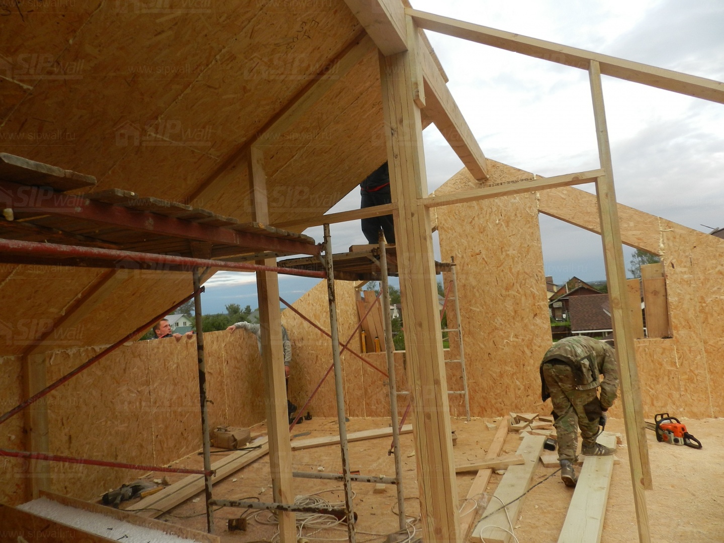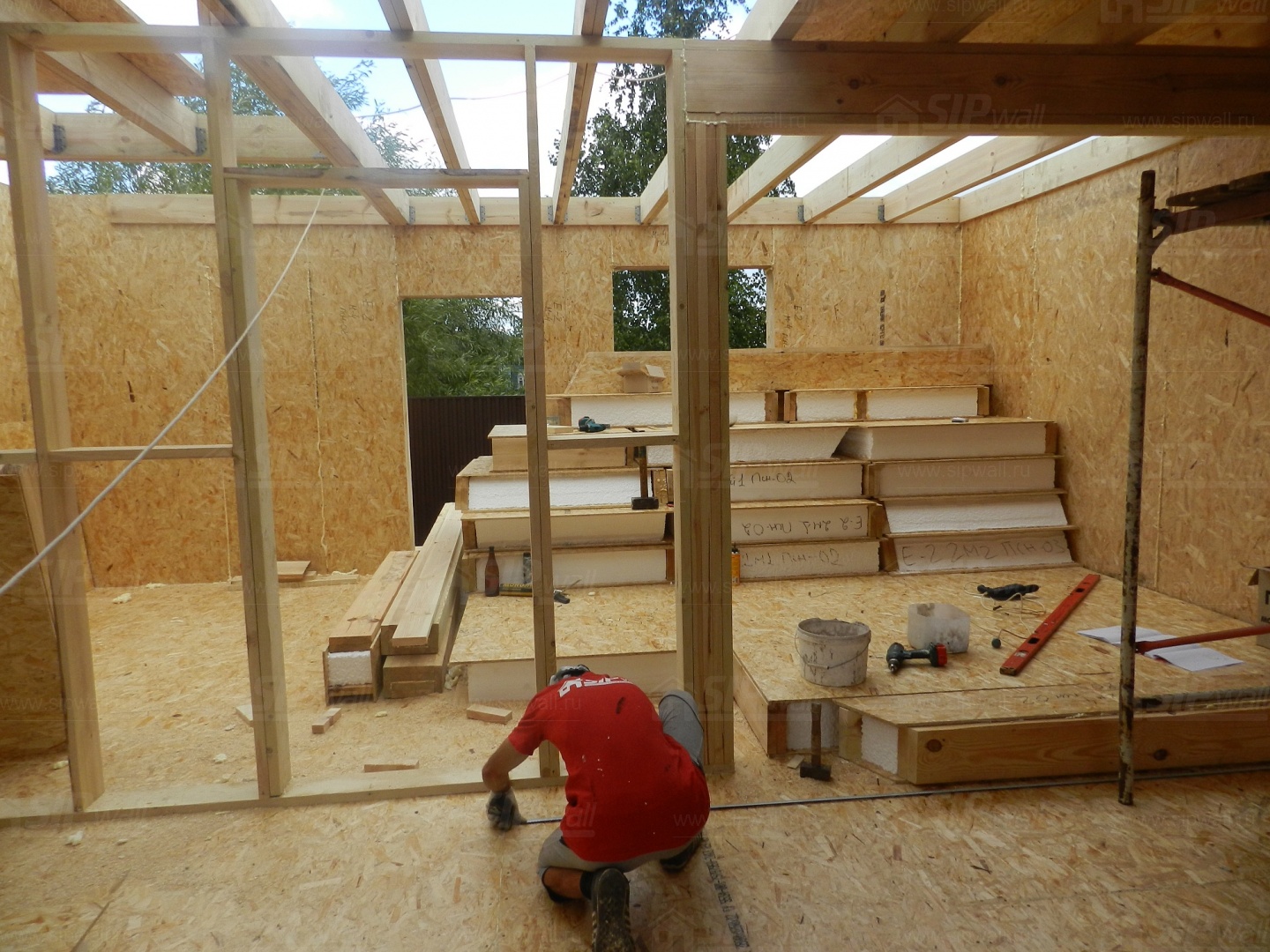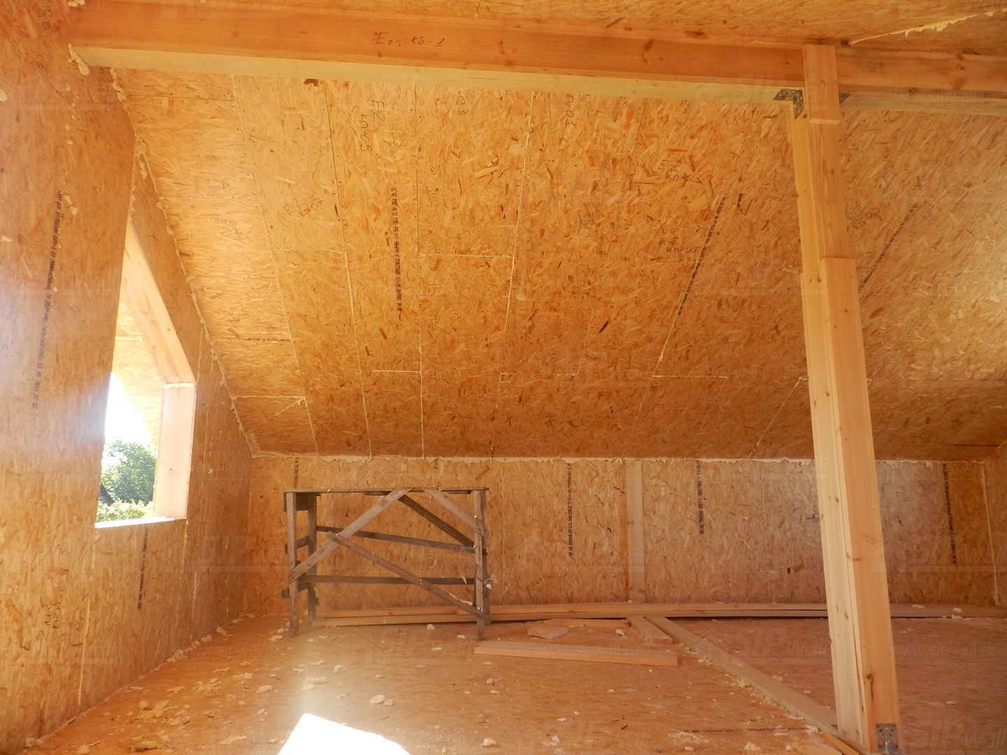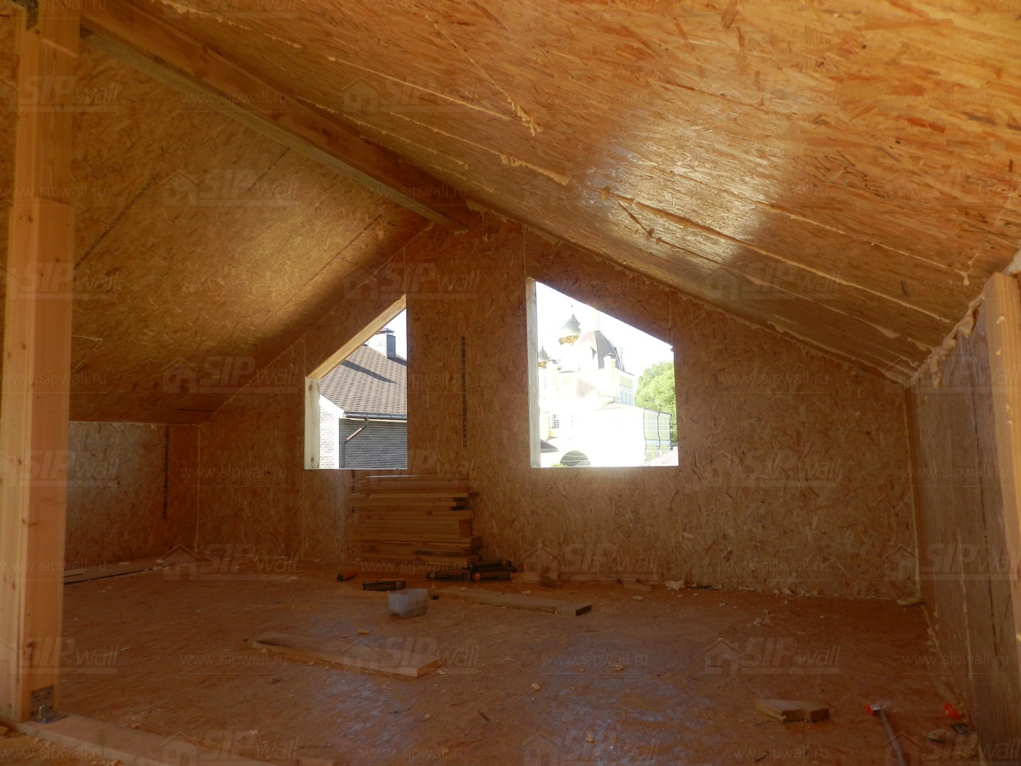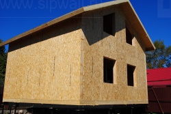 Все СИП панели SIPwall толщиной 224/174/124 мм (плиты OSB-3 толщиной 12 мм "Калевала" Россия и фасадный пенополистирол ПСБ-С 25 по ГОСТ 15588-14 толщиной 200/150/100 мм производства завода "PolarPlast", Россия) нарезаны и обрусованы сухим строганным брусом камерной сушки в соответствии с проектной документацией.