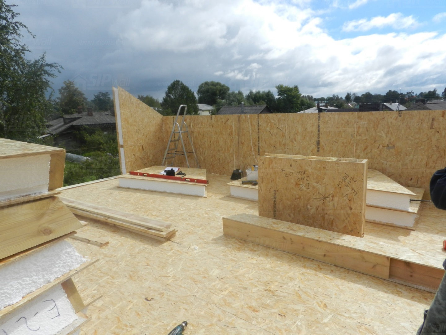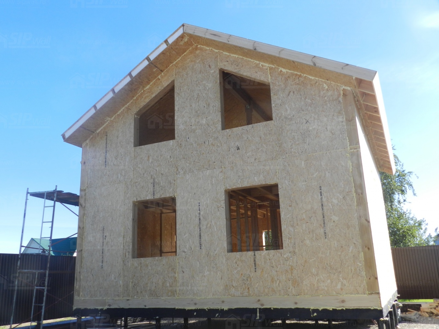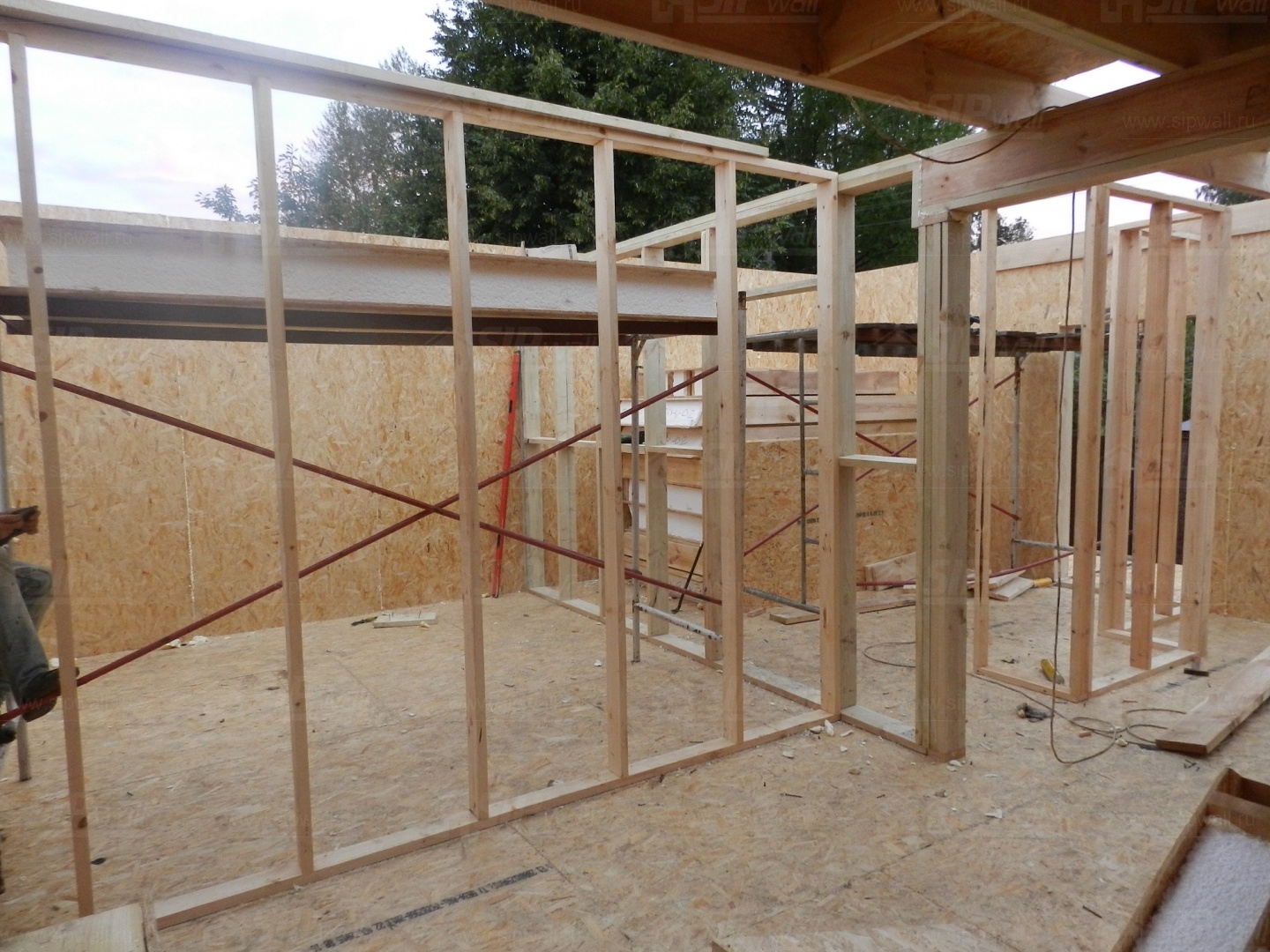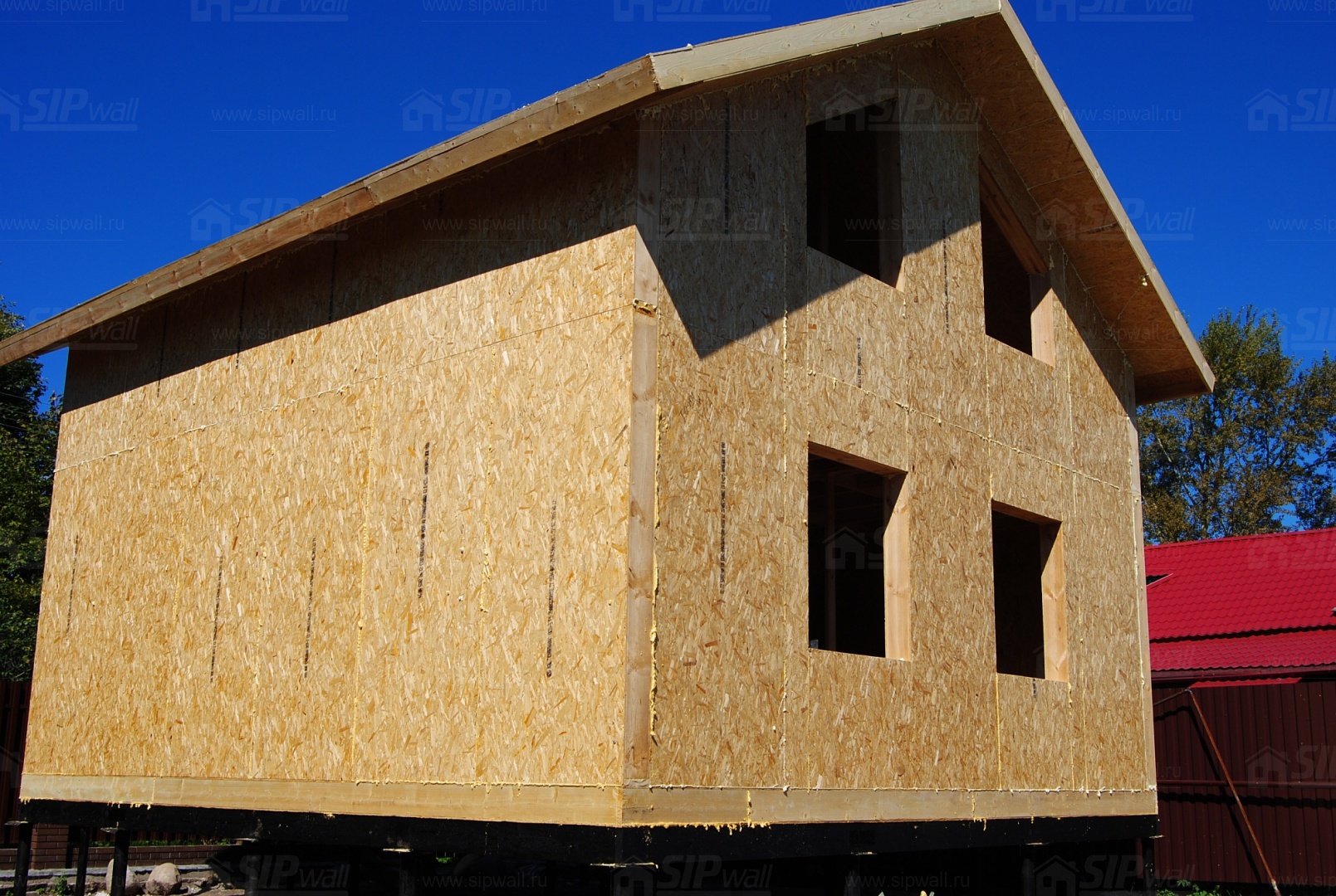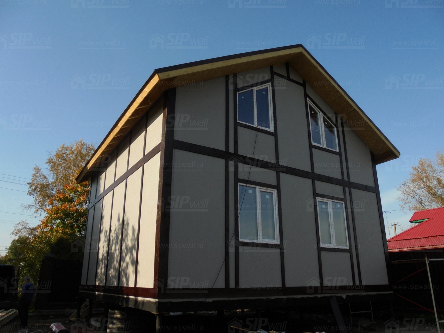 Все СИП панели SIPwall толщиной 224/174/124 мм (плиты OSB-3 толщиной 12 мм "Калевала" Россия и фасадный пенополистирол ПСБ-С 25 по ГОСТ 15588-14 толщиной 200/150/100 мм производства завода "PolarPlast", Россия) нарезаны и обрусованы сухим строганным брусом камерной сушки в соответствии с проектной документацией.