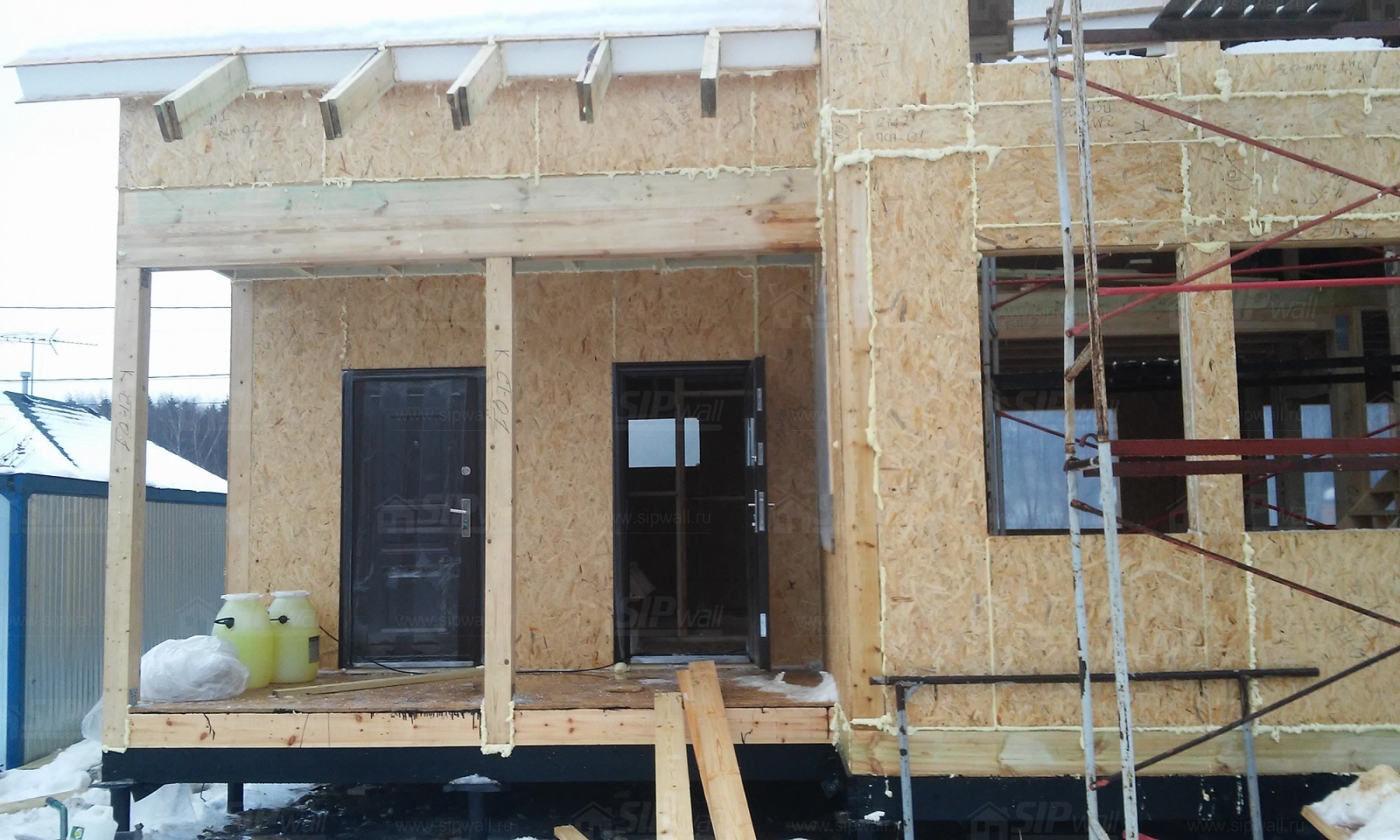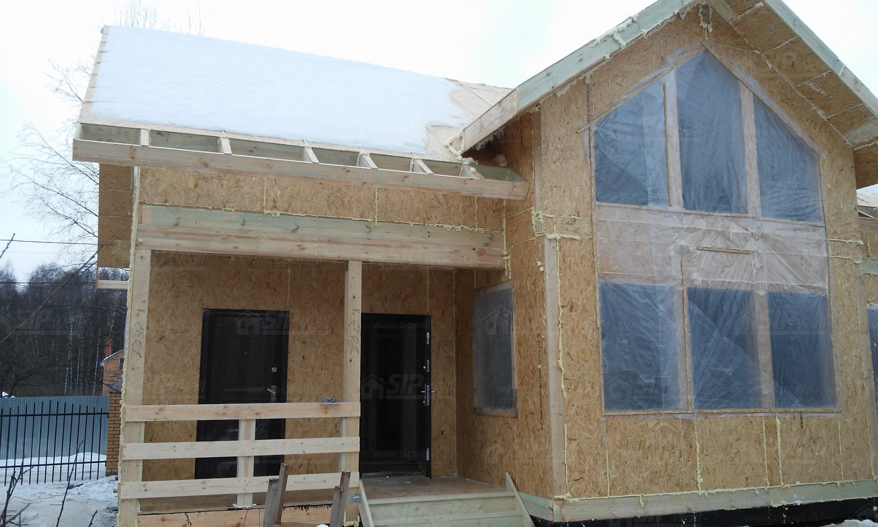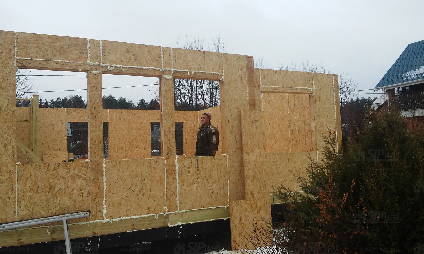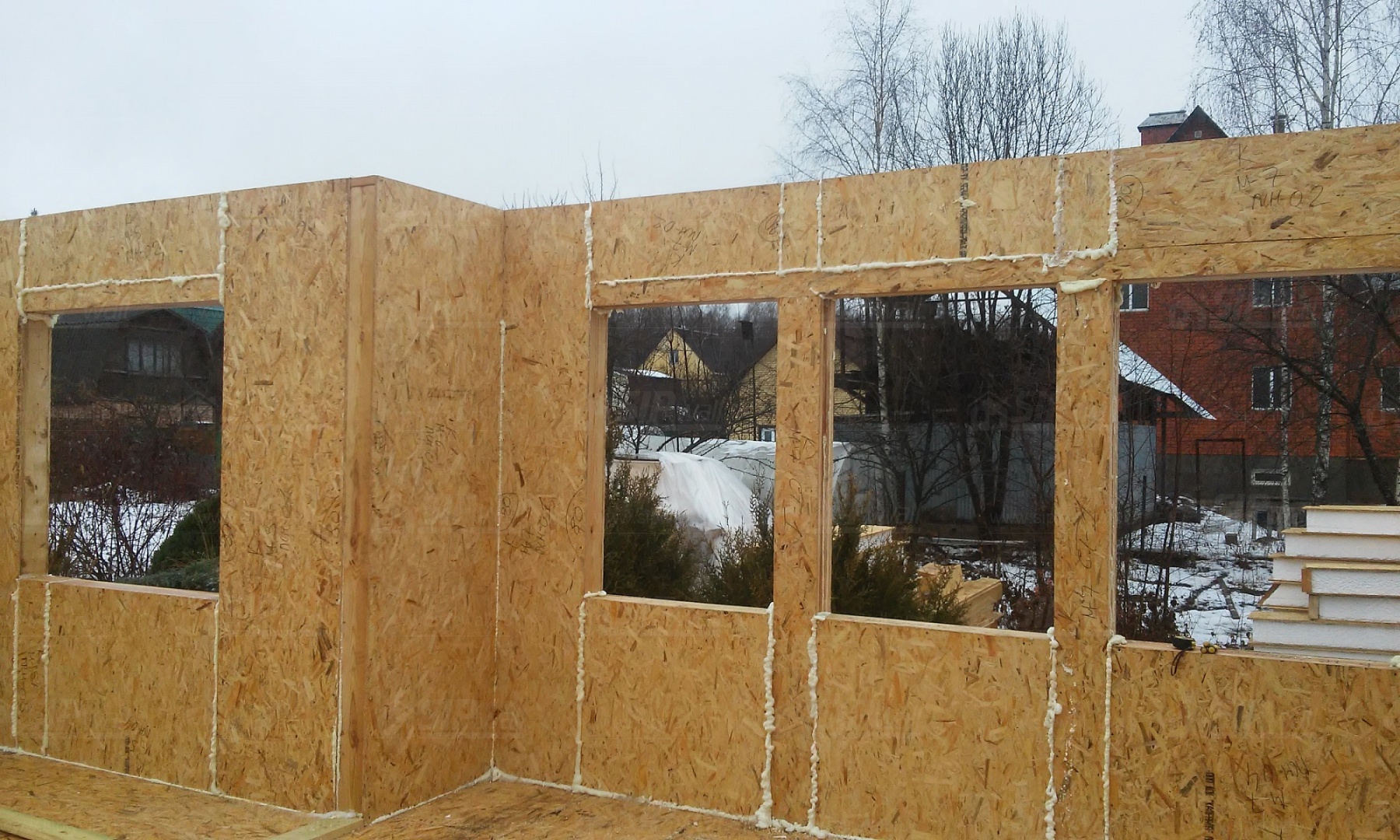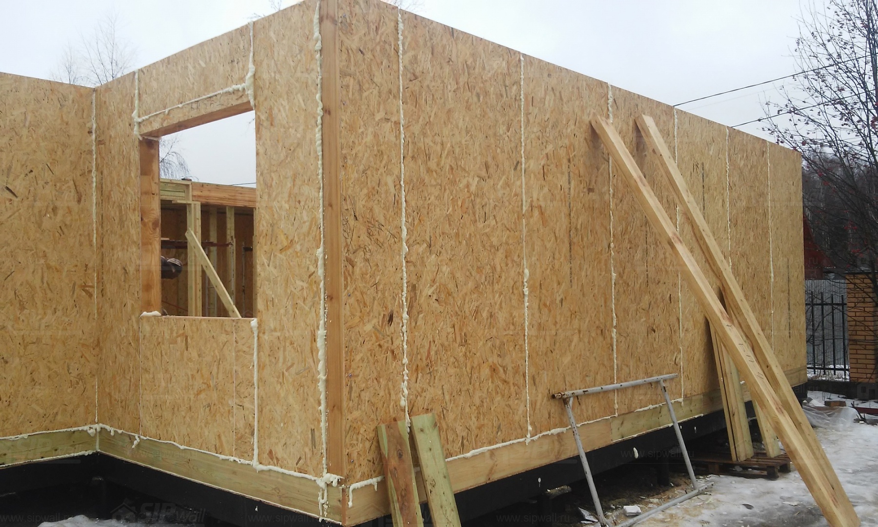 Все СИП панели SIPwall толщиной 224/174/124 мм (плиты OSB-3 толщиной 12 мм "Калевала" Россия и фасадный пенополистирол ПСБ-С 25 по ГОСТ 15588-14 толщиной 200/150/100 мм производства завода "PolarPlast", Россия) нарезаны и обрусованы сухим строганным брусом камерной сушки в соответствии с проектной документацией.