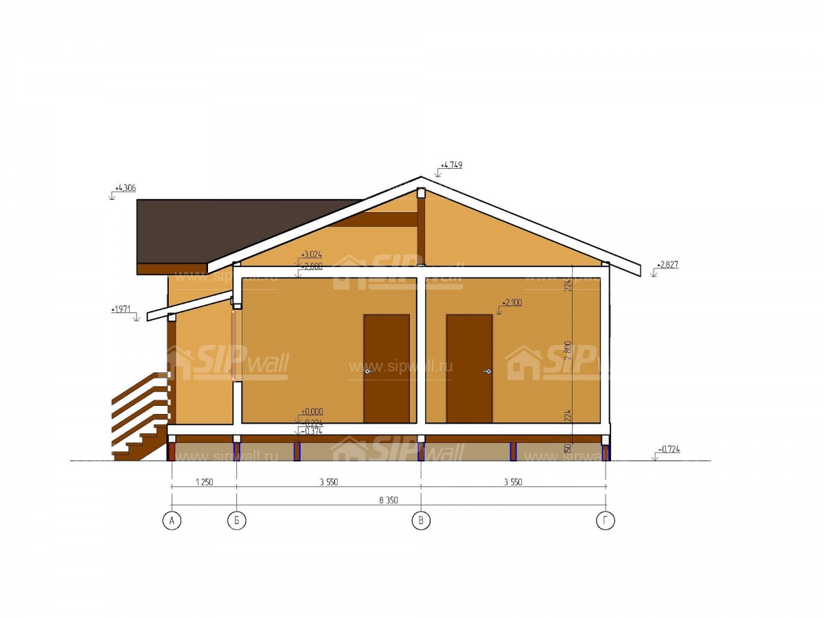 | Трехслойная усиленная СИП панель SIPwall 224У/174У мм (OSB-3 12 мм, Россия, фасадный самозатухающий пенополистирол ППС 14 200/150 мм, Россия), вшитый конструктивный пиломатериал камерной сушки, строганный, обработанный огнебиозащитным составом «Wood Shield» в заводских условиях. | X | X | X | X | |||