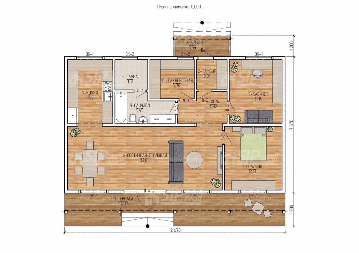| Трехслойная СИП панель SIPwall 124 мм (OSB-3 12 мм, Россия, фасадный самозатухающий пенополистирол ППС 14 100 мм, Россия), вшитый конструктивный пиломатериал камерной сушки, строганный, обработанный огнебиозащитным составом «Wood Shield» в заводских условиях. | X | ||||||