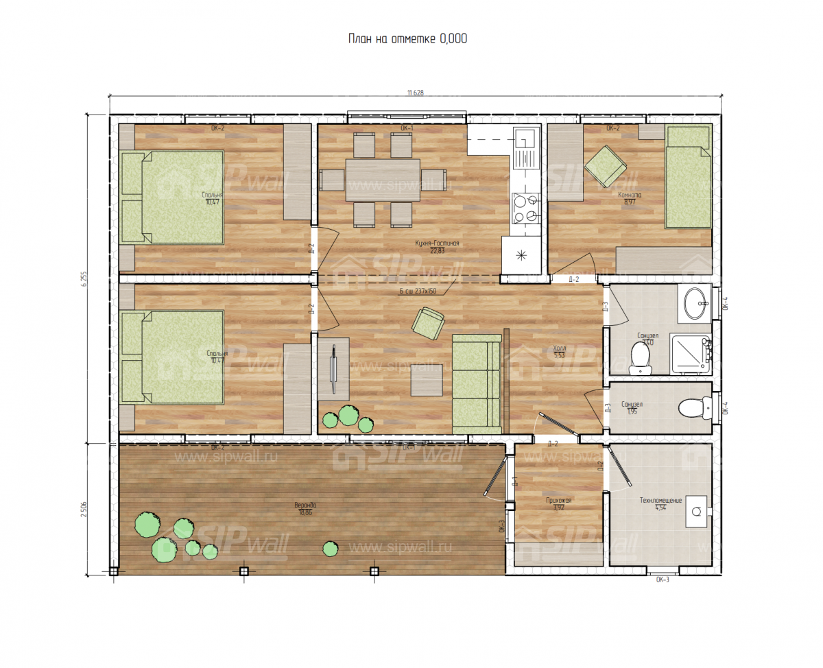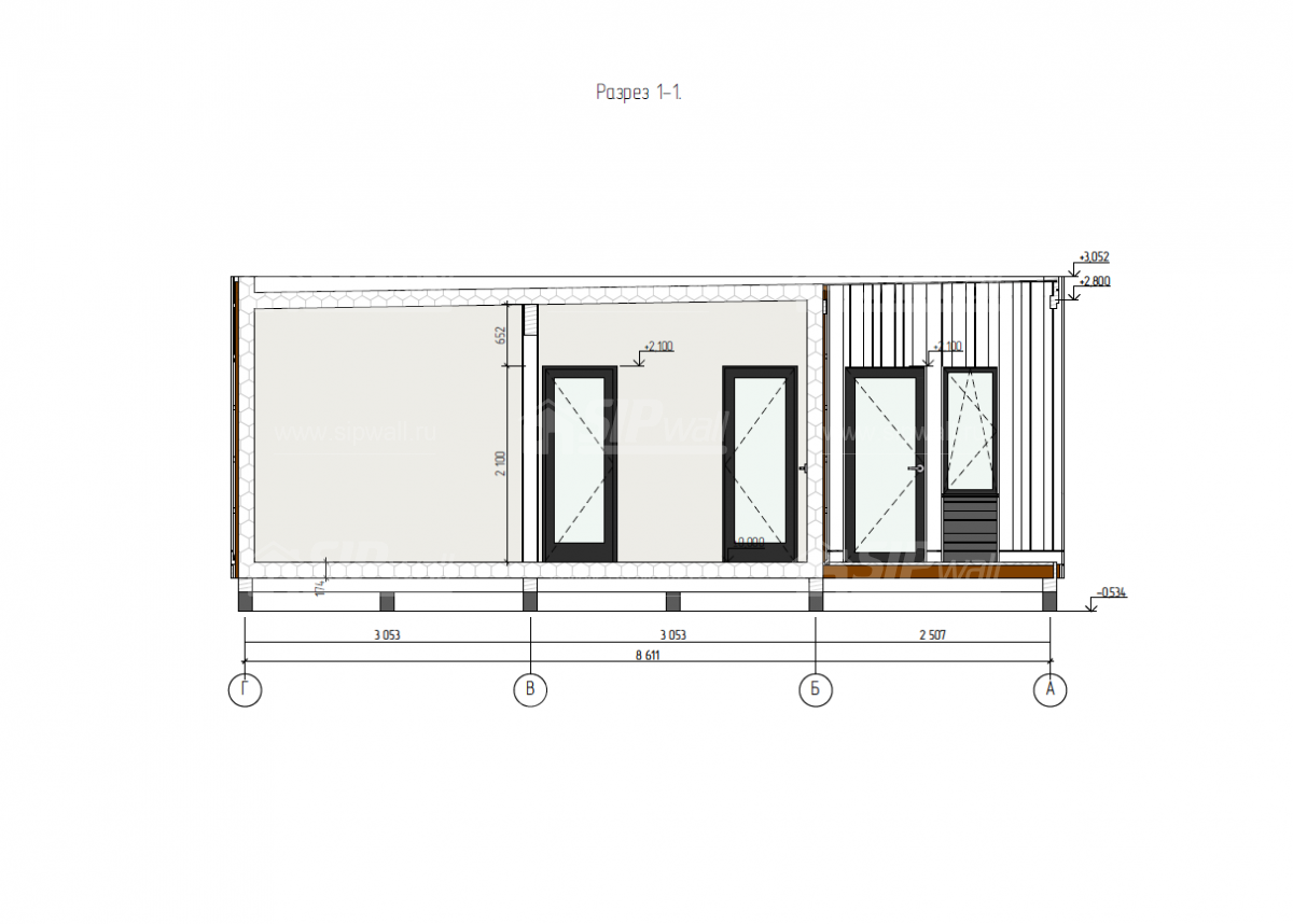 | Трехслойная СИП панель SIPwall 124 мм (OSB-3 12 мм, Россия, фасадный самозатухающий пенополистирол ППС 14 100 мм, Россия), вшитый конструктивный пиломатериал камерной сушки, строганный, обработанный огнебиозащитным составом «Wood Shield» в заводских условиях. | X | ||||||