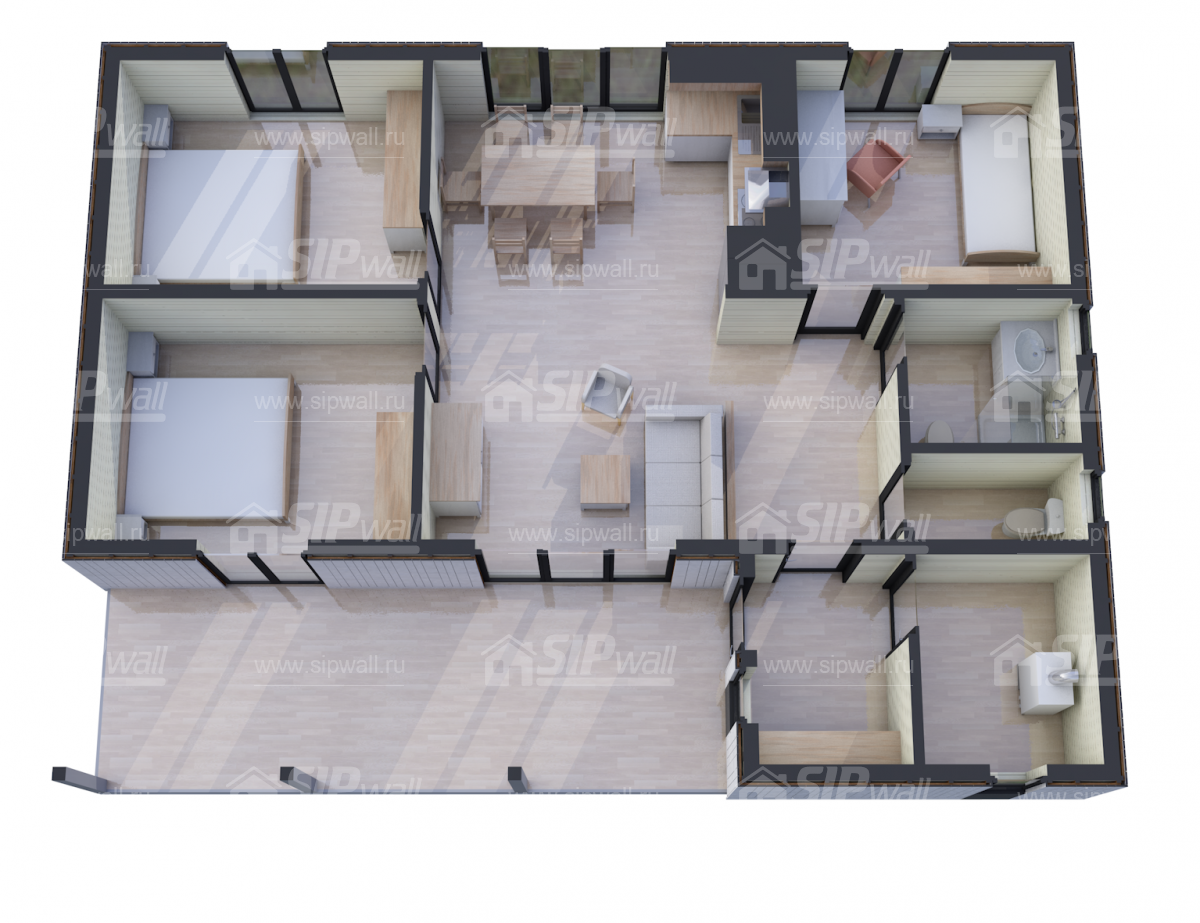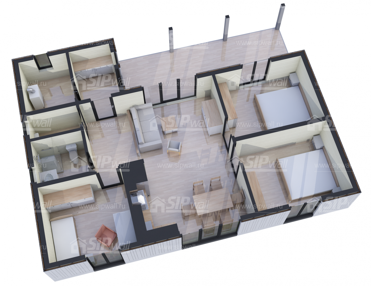 | Домокомплект изготавливается из трехслойных СИП панелей, произведенных по технологии SIPwall (ЭКОПАН) на собственном заводе, расположенном в г. Шуя, Ивановской области. При изготовлении домокомплекта панельно-каркасного дома используется только строганный пиломатериал камерной сушки, обработанный огнебиозащитным составом «Wood Shield» в заводских условиях. Все СИП панели домокомплекта изготовлены в соответствии с конструктивной проектной документацией, разработанной собственным проектным отдел компании SIPwall, и обрусованы сухим строганным пиломатериалом. На выходе с завода SIPwall домокомплект имеет 99%-ю готовность. | |||||||