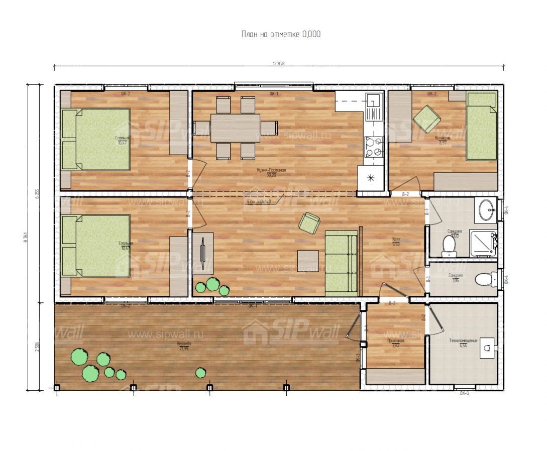 | Трехслойная СИП панель SIPwall 124 мм (OSB-3 12 мм, Россия, фасадный самозатухающий пенополистирол ППС 14 100 мм, Россия), вшитый конструктивный пиломатериал камерной сушки, строганный, обработанный огнебиозащитным составом «Wood Shield» в заводских условиях. | X | ||||||