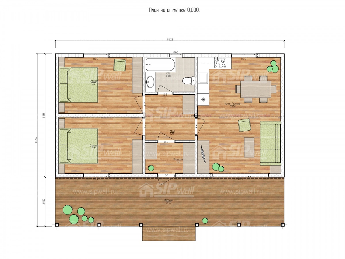 | Трехслойная СИП панель SIPwall 124 мм (OSB-3 12 мм, Россия, фасадный самозатухающий пенополистирол ППС 14 100 мм, Россия), вшитый конструктивный пиломатериал камерной сушки, строганный, обработанный огнебиозащитным составом «Wood Shield» в заводских условиях. | X | ||||||