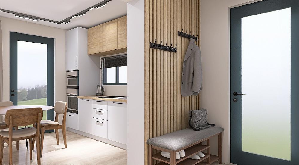 • Окна и двери: энергоэффективные двухкамерные стеклопакеты (класс А+) 72 мм, 5-камерный профиль толщина стеклопакета — 40 мм (цвет графит/шоколад).