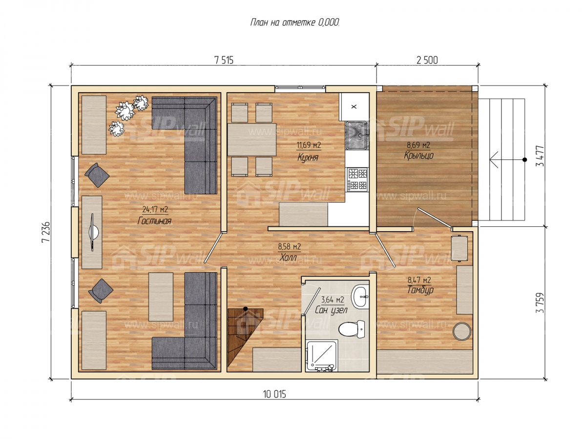 | Трехслойная СИП панель SIPwall 124 мм (OSB-3 12 мм, Россия, фасадный самозатухающий пенополистирол ППС 14 100 мм, Россия), вшитый конструктивный пиломатериал камерной сушки, строганный, обработанный огнебиозащитным составом «Wood Shield» в заводских условиях. | X | ||||||
