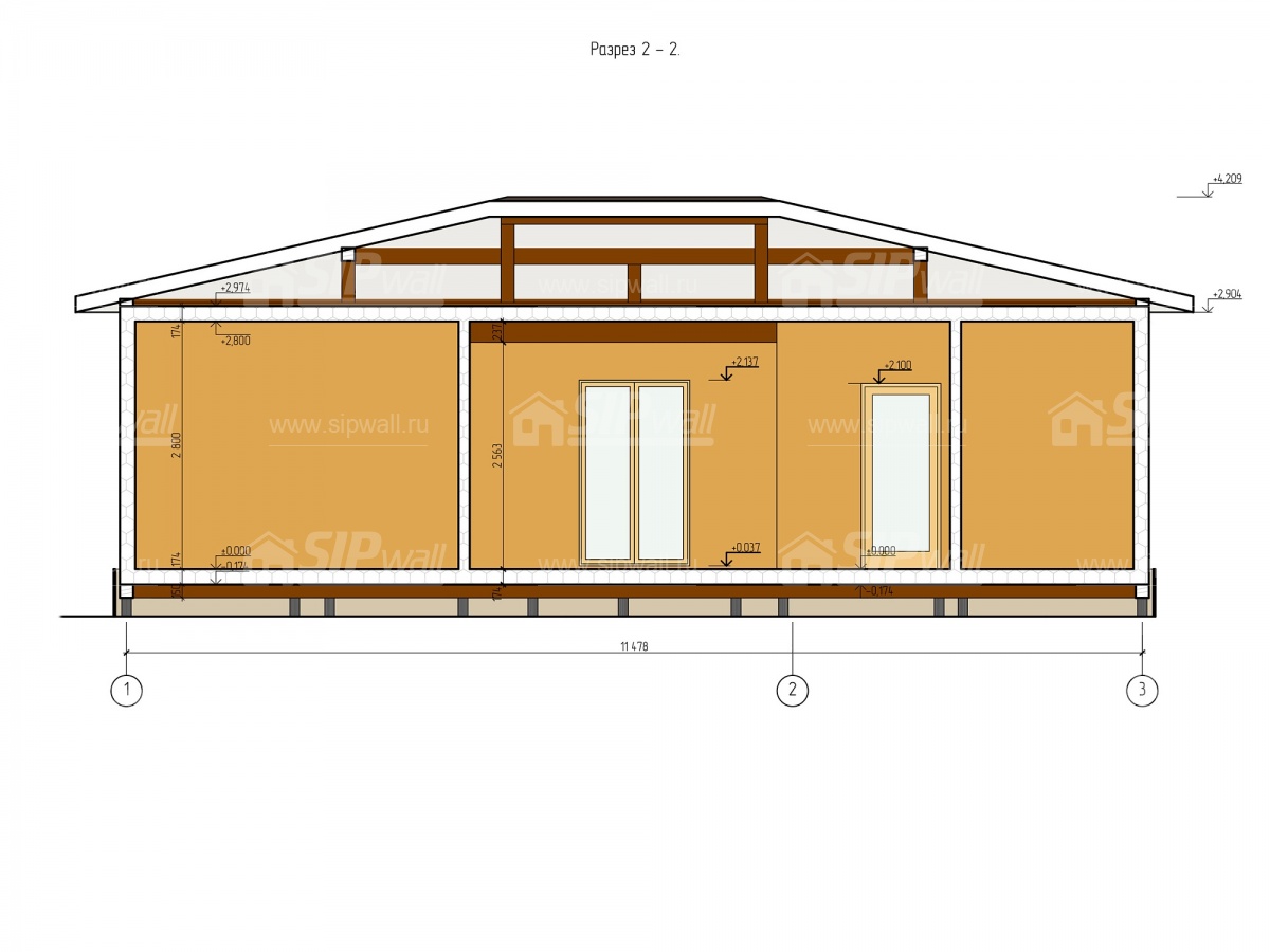 | Трехслойная усиленная СИП панель SIPwall 224У/174У мм (OSB-3 12 мм, Россия, фасадный самозатухающий пенополистирол ППС 14 200/150 мм, Россия), вшитый конструктивный пиломатериал камерной сушки, строганный, обработанный огнебиозащитным составом «Wood Shield» в заводских условиях. | X | X | X | X | |||