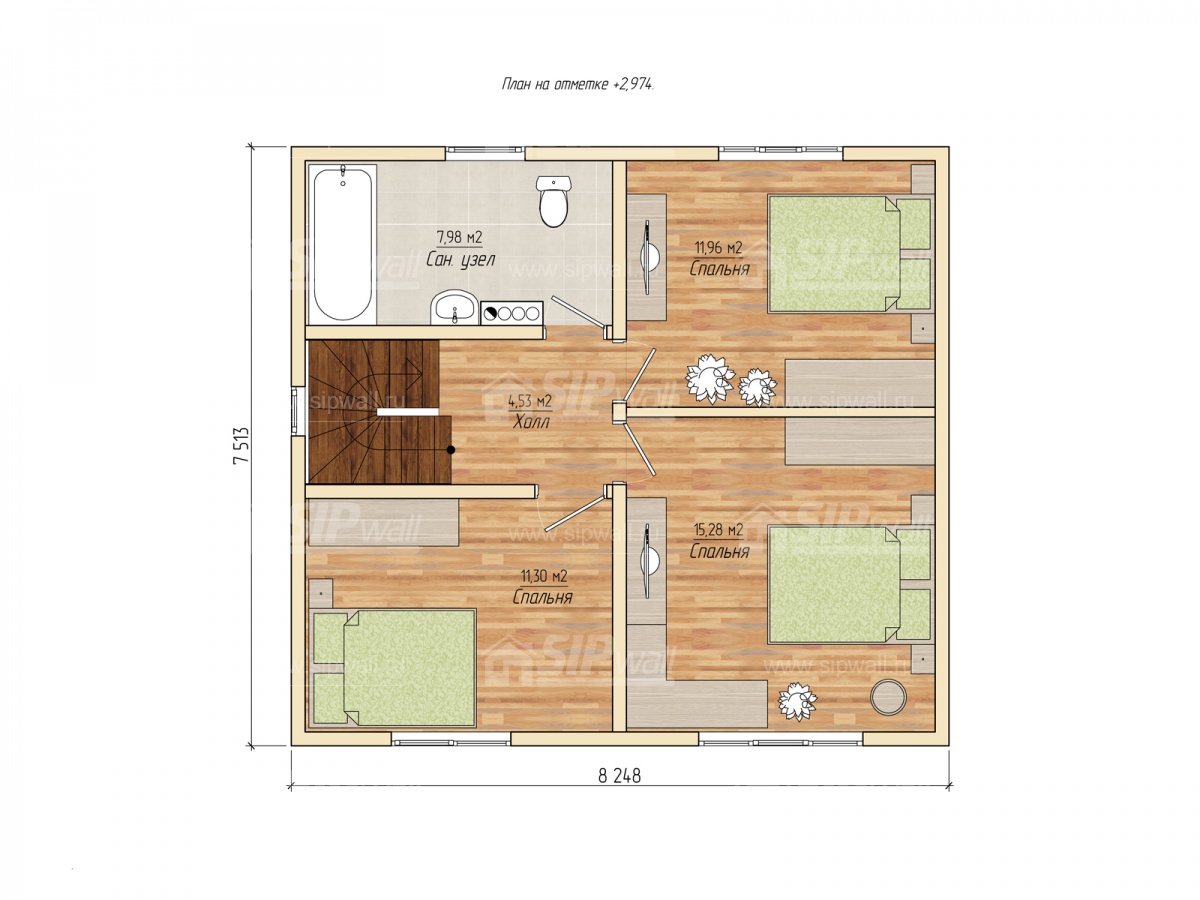 | Трехслойная усиленная СИП панель SIPwall 224У/174У мм (OSB-3 12 мм, Россия, фасадный самозатухающий пенополистирол ППС 14 200/150 мм, Россия), вшитый конструктивный пиломатериал камерной сушки, строганный, обработанный огнебиозащитным составом «Wood Shield» в заводских условиях. | X | X | X | ||||