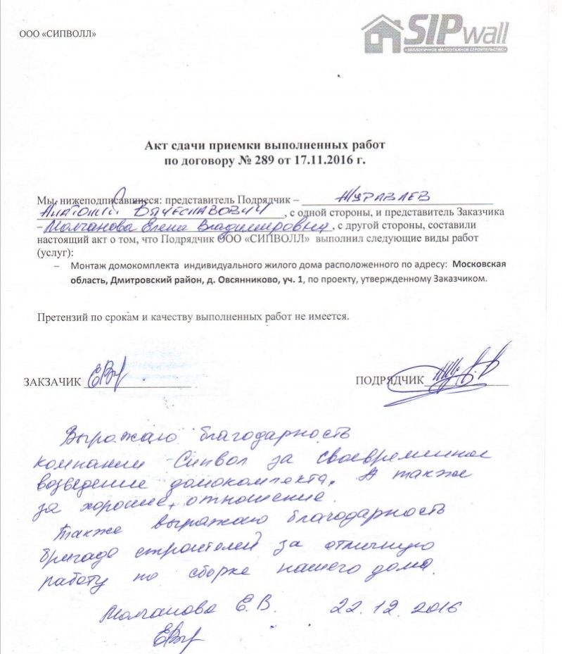 Выражаю благодарность компании СИПВОЛЛ за своевременное возведение домокомплекта. А также за хорошее отношение.